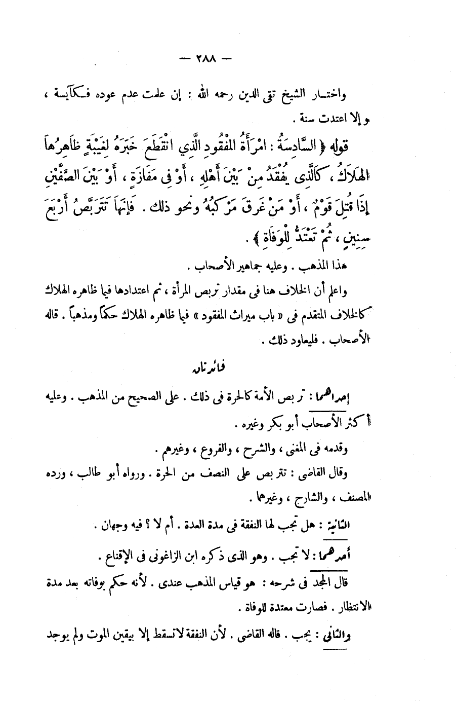 وَاخْتَارَ الشَّيْخُ تَقِيُّ الدِّينِ - رَحِمَهُ اللَّهُ -: إنْ عَلِمَتْ عَدَمَ عَوْدِهِ فَكَآيِسَةٍ، وَإِلَّا اعْتَدَّتْ سَنَةً.