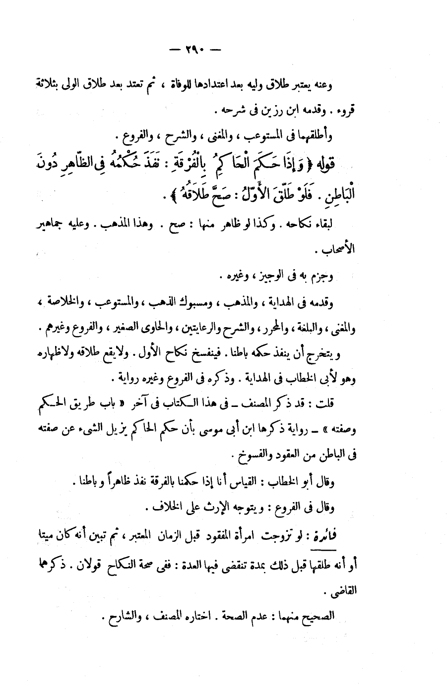 قَوْلُهُ (وَإِذَا حَكَمَ الْحَاكِمُ بِالْفُرْقَةِ: نَفَذَ حُكْمُهُ فِي الظَّاهِرِ دُونَ الْبَاطِنِ. فَلَوْ طَلَّقَ الْأَوَّلُ: صَحَّ طَلَاقُهُ) . لِبَقَاءِ نِكَاحِهِ. وَكَذَا لَوْ ظَاهَرَ مِنْهَا: صَحَّ. وَهَذَا الْمَذْهَبُ. وَعَلَيْهِ جَمَاهِيرُ الْأَصْحَابِ. وَجَزَمَ بِهِ فِي الْوَجِيزِ، وَغَيْرِهِ. وَقَدَّمَهُ فِي الْهِدَايَةِ، وَالْمُذْهَبِ، وَمَسْبُوكِ الذَّهَبِ، وَالْمُسْتَوْعِبِ، وَالْخُلَاصَةِ، وَالْمُغْنِي، وَالْبُلْغَةِ، وَالْمُحَرَّرِ، وَالشَّرْحِ وَالرِّعَايَتَيْنِ، وَالْحَاوِي الصَّغِيرِ، وَالْفُرُوعِ وَغَيْرِهِمْ. وَيَتَخَرَّجُ أَنْ يَنْفُذَ حُكْمُهُ بَاطِنًا. فَيَنْفَسِخُ نِكَاحُ الْأَوَّلِ. وَلَا يَقَعُ طَلَاقُهُ وَلَا ظِهَارُهُ وَهُوَ لِأَبِي الْخَطَّابِ فِي الْهِدَايَةِ. وَذَكَرَهُ فِي الْفُرُوعِ وَغَيْرِهِ رِوَايَةً. قُلْت: قَدْ ذَكَرَ الْمُصَنِّفُ فِي هَذَا الْكِتَابِ فِي آخِرِ " بَابِ طَرِيقِ الْحُكْمِ وَصِفَتِهِ " رِوَايَةً ذَكَرَهَا ابْنُ أَبِي مُوسَى بِأَنَّ حُكْمَ الْحَاكِمِ يُزِيلُ الشَّيْءَ عَنْ صِفَتِهِ فِي الْبَاطِنِ مِنْ الْعُقُودِ وَالْفُسُوخِ. وَقَالَ أَبُو الْخَطَّابِ: الْقِيَاسُ أَنَّا إذَا حَكَمْنَا بِالْفُرْقَةِ نَفَذَ ظَاهِرًا وَبَاطِنًا. وَقَالَ فِي الْفُرُوعِ: وَيَتَوَجَّهُ الْإِرْثُ عَلَى الْخِلَافِ.