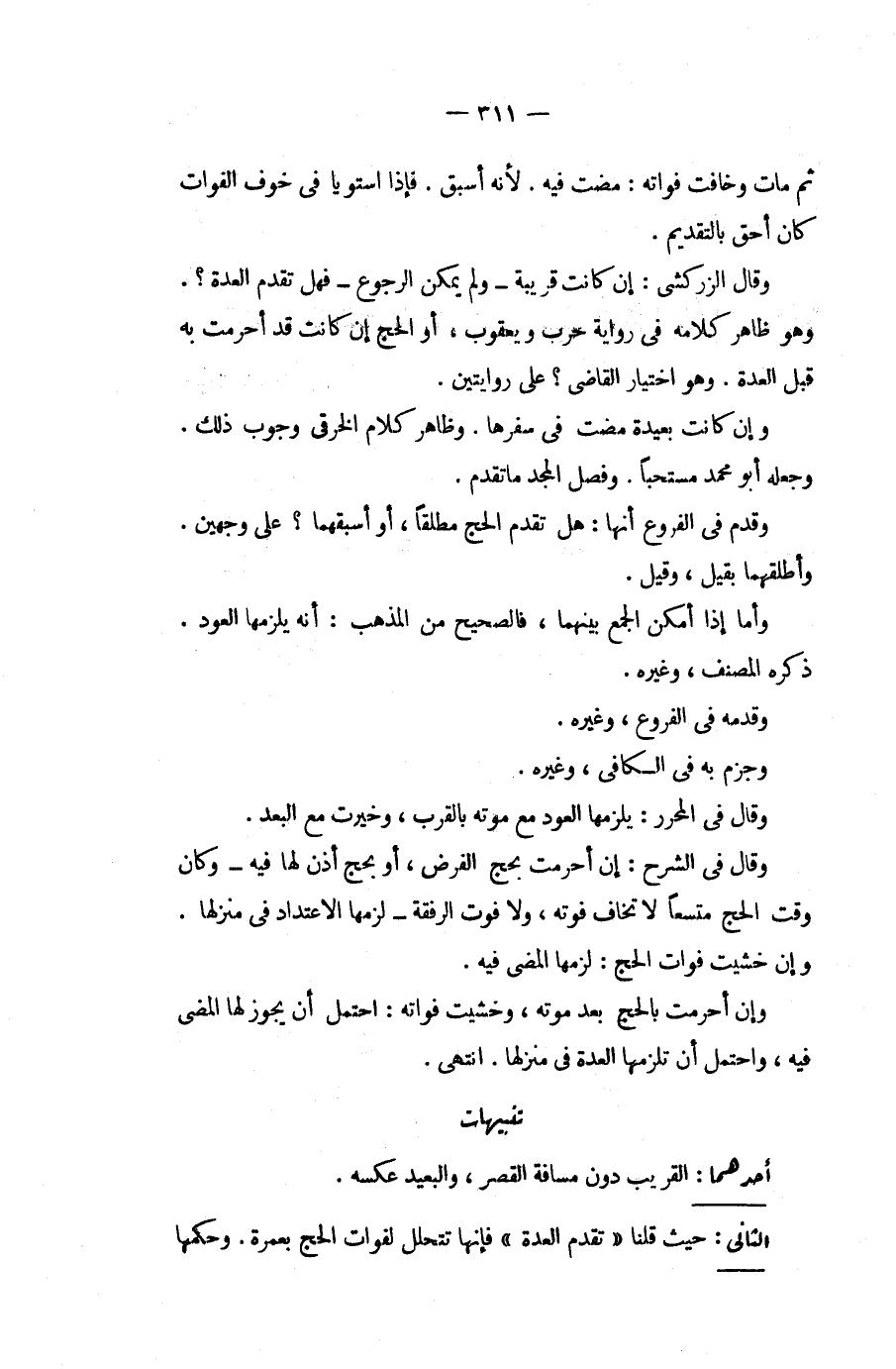 ثُمَّ مَاتَ وَخَافَتْ فَوَاتَهُ: مَضَتْ فِيهِ. لِأَنَّهُ أَسْبَقُ. فَإِذَا اسْتَوَيَا فِي خَوْفِ الْفَوَاتِ كَانَ أَحَقَّ بِالتَّقْدِيمِ. وَقَالَ الزَّرْكَشِيُّ: إنْ كَانَتْ قَرِيبَةً وَلَمْ يُمْكِنْ الرُّجُوعُ فَهَلْ تُقَدِّمُ الْعِدَّةَ؟ . وَهُوَ ظَاهِرُ كَلَامِهِ فِي رِوَايَةِ حَرْبٍ وَيَعْقُوبَ، أَوْ الْحَجَّ إنْ كَانَتْ قَدْ أَحْرَمَتْ بِهِ قَبْلَ الْعِدَّةِ. وَهُوَ اخْتِيَارُ الْقَاضِي؟ عَلَى رِوَايَتَيْنِ. وَإِنْ كَانَتْ بَعِيدَةً مَضَتْ فِي سَفَرِهَا. وَظَاهِرُ كَلَامِ الْخِرَقِيِّ وُجُوبُ ذَلِكَ. وَجَعَلَهُ أَبُو مُحَمَّدٍ مُسْتَحَبًّا. وَفَصَّلَ الْمَجْدُ مَا تَقَدَّمَ. وَقَدَّمَ فِي الْفُرُوعِ أَنَّهَا: هَلْ تُقَدِّمُ الْحَجَّ مُطْلَقًا، أَوْ أَسْبَقَهُمَا؟ عَلَى وَجْهَيْنِ. وَأَطْلَقَهُمَا بِقِيلِ، وَقِيلَ. وَأَمَّا إذَا أَمْكَنَ الْجَمْعُ بَيْنَهُمَا، فَالصَّحِيحُ مِنْ الْمَذْهَبِ: أَنَّهُ يَلْزَمُهَا الْعَوْدُ. ذَكَرَهُ الْمُصَنِّفُ، وَغَيْرُهُ. وَقَدَّمَهُ فِي الْفُرُوعِ، وَغَيْرِهِ. وَجَزَمَ بِهِ فِي الْكَافِي، وَغَيْرِهِ. وَقَالَ فِي الْمُحَرَّرِ: يَلْزَمُهَا الْعَوْدُ مَعَ مَوْتِهِ بِالْقُرْبِ، وَخُيِّرَتْ مَعَ الْبُعْدِ. وَقَالَ فِي الشَّرْحِ: إنْ أَحْرَمَتْ بِحَجٍّ لِلْفَرْضِ، أَوْ بِحَجٍّ أَذِنَ لَهَا فِيهِ وَكَانَ وَقْتُ الْحَجِّ مُتَّسِعًا لَا تَخَافُ فَوْتَهُ، وَلَا فَوْتَ الرُّفْقَةِ لَزِمَهَا الِاعْتِدَادُ فِي مَنْزِلِهَا. وَإِنْ خَشِيَتْ فَوَاتَ الْحَجِّ: لَزِمَهَا الْمُضِيُّ فِيهِ. وَإِنْ أَحْرَمَتْ بِالْحَجِّ بَعْدَ مَوْتِهِ، وَخَشِيَتْ فَوَاتَهُ: احْتَمَلَ أَنْ يَجُوزَ لَهَا الْمُضِيُّ فِيهِ، وَاحْتَمَلَ أَنْ تَلْزَمَهَا الْعِدَّةُ فِي مَنْزِلِهَا. انْتَهَى.