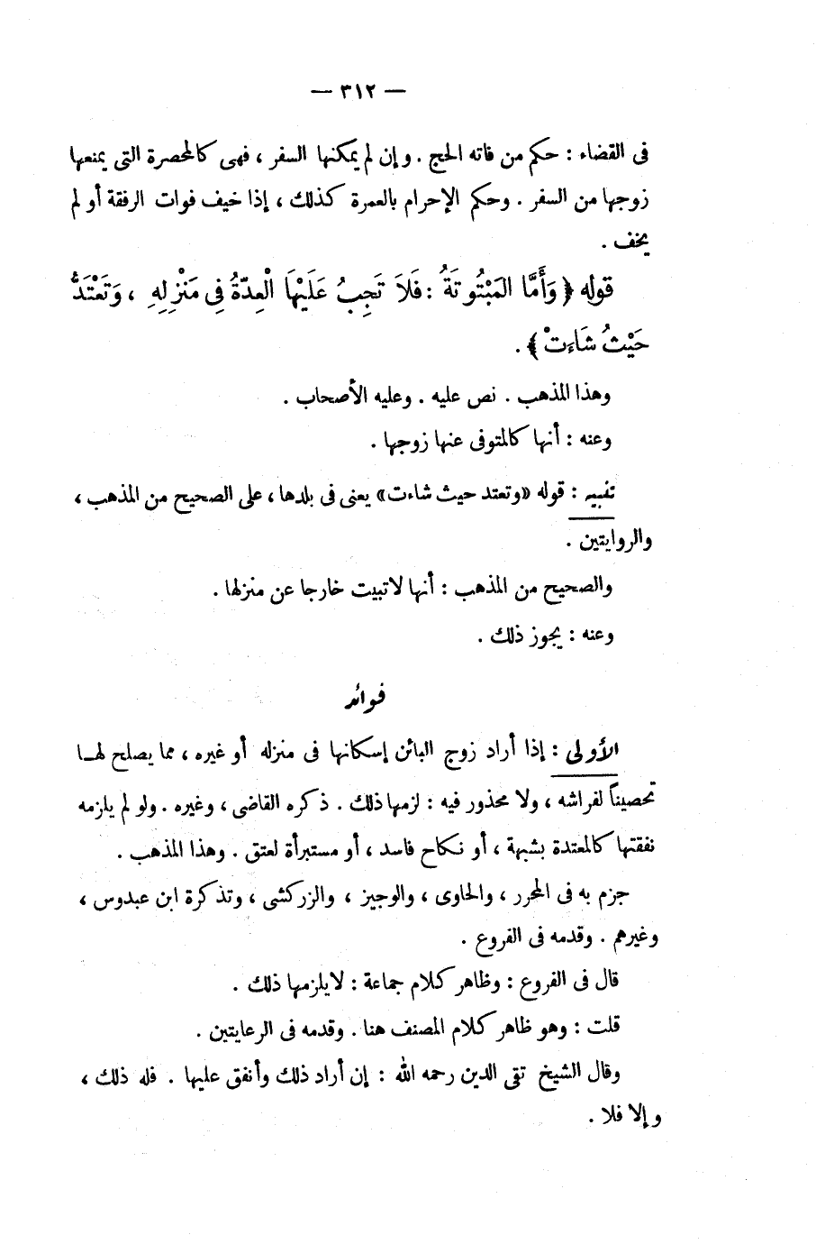 الْأُولَى: إذَا أَرَادَ زَوْجُ الْبَائِنِ إسْكَانُهَا فِي مَنْزِلِهِ أَوْ غَيْرِهِ، مِمَّا يَصْلُحُ لَهَا تَحْصِينًا لِفِرَاشِهِ، وَلَا مَحْذُورَ فِيهِ: لَزِمَهَا ذَلِكَ. ذَكَرَهُ الْقَاضِي، وَغَيْرُهُ. وَلَوْ لَمْ يَلْزَمْهُ نَفَقَتُهَا كَالْمُعْتَدَّةِ بِشُبْهَةٍ، أَوْ نِكَاحٍ فَاسِدٍ، أَوْ مُسْتَبْرَأَةٍ لِعِتْقٍ. وَهَذَا الْمَذْهَبُ. جَزَمَ بِهِ فِي الْمُحَرَّرِ، وَالْحَاوِي، وَالْوَجِيزِ، وَالزَّرْكَشِيُّ، وَتَذْكِرَةِ ابْنِ عَبْدُوسٍ، وَغَيْرِهِمْ. وَقَدَّمَهُ فِي الْفُرُوعِ. قَالَ فِي الْفُرُوعِ: وَظَاهِرُ كَلَامِ جَمَاعَةٍ: لَا يَلْزَمُهَا ذَلِكَ. قُلْت: وَهُوَ ظَاهِرُ كَلَامِ الْمُصَنِّفِ هُنَا. وَقَدَّمَهُ فِي الرِّعَايَتَيْنِ. وَقَالَ الشَّيْخُ تَقِيُّ الدِّينِ - رَحِمَهُ اللَّهُ -: لِمَنْ أَرَادَ ذَلِكَ وَأَنْفَقَ عَلَيْهَا. فَلَهُ ذَلِكَ، وَإِلَّا فَلَا.