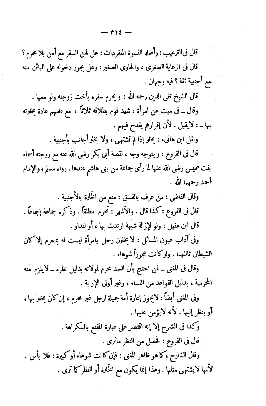 قَالَ فِي التَّرْغِيبِ: وَأَصْلُهُ النِّسْوَةُ الْمُنْفَرِدَاتُ: هَلْ لَهُنَّ السَّفَرُ مَعَ أَمْنٍ بِلَا مَحْرَمٍ؟ قَالَ فِي الرِّعَايَةِ الصُّغْرَى، وَالْحَاوِي الصَّغِيرِ: وَهَلْ يَجُوزُ دُخُولُهُ عَلَى الْبَائِنِ مِنْهُ مَعَ أَجْنَبِيَّةٍ ثِقَةٍ؟ فِيهِ وَجْهَانِ. قَالَ الشَّيْخُ تَقِيُّ الدِّينِ - رَحِمَهُ اللَّهُ -: وَيَحْرُمُ سَفَرُهُ بِأُخْتِ زَوْجَتِهِ وَلَوْ مَعَهَا. وَقَالَ فِي مَيِّتٍ عَنْ امْرَأَةٍ، شَهِدَ قَوْمٌ بِطَلَاقِهِ ثَلَاثًا مَعَ عِلْمِهِمْ عَادَةً بِخَلْوَتِهِ بِهَا: لَا يُقْبَلُ. لِأَنَّ إقْرَارَهُمْ يَقْدَحُ فِيهِمْ. وَنَقَلَ ابْنُ هَانِئٍ: يَخْلُو إذَا لَمْ تُشْتَهَى، وَلَا يَخْلُو أَجَانِبُ بِأَجْنَبِيَّةٍ. قَالَ فِي الْفُرُوعِ: وَيَتَوَجَّهُ وَجْهٌ، لِقِصَّةِ أَبِي بَكْرٍ - رَضِيَ اللَّهُ عَنْهُ - مَعَ زَوْجَتِهِ أَسْمَاءَ بِنْتِ عُمَيْسٍ - رَضِيَ اللَّهُ عَنْهَا - لَمَّا رَأَى جَمَاعَةً مِنْ بَنِي هَاشِمٍ عِنْدَهَا. رَوَاهُ مُسْلِمٌ، وَالْإِمَامُ أَحْمَدُ رَحِمَهُمَا اللَّهُ. وَقَالَ الْقَاضِي: مَنْ عُرِفَ بِالْفِسْقِ: مُنِعَ مِنْ الْخَلْوَةِ بِالْأَجْنَبِيَّةِ. قَالَ فِي الْفُرُوعِ: كَذَا قَالَ. وَالْأَشْهَرُ: تَحْرُمُ مُطْلَقًا. وَذَكَرَهُ جَمَاعَةٌ إجْمَاعًا. قَالَ ابْنُ عَقِيلٍ: وَلَوْ لِإِزَالَةِ شُبْهَةٍ ارْتَدَّتْ بِهَا، أَوْ لِتَدَاوٍ. وَفِي آدَابِ عُيُونِ الْمَسَائِلِ: «لَا يَخْلُوَنَّ رَجُلٌ بِامْرَأَةٍ لَيْسَتْ لَهُ بِمَحْرَمٍ إلَّا كَانَ الشَّيْطَانُ ثَالِثَهُمَا. وَلَوْ كَانَتْ عَجُوزًا شَوْهَاءَ» . وَقَالَ فِي الْمُغْنِي لِمَنْ احْتَجَّ بِأَنَّ الْعَبْدَ مَحْرَمٌ لِمَوْلَاتِهِ بِدَلِيلِ نَظَرِهِ لَا يَلْزَمُ مِنْهُ الْمَحْرَمِيَّةُ، بِدَلِيلِ الْقَوَاعِدِ مِنْ النِّسَاءِ، وَغَيْرِ أُولِي الْإِرْبَةِ. وَفِي الْمُغْنِي أَيْضًا: لَا يَجُوزُ إعَارَةُ أَمَةٍ جَمِيلَةٍ لِرَجُلٍ غَيْرِ مَحْرَمٍ، إنْ كَانَ يَخْلُو بِهَا، أَوْ يَنْظُرُ إلَيْهَا. لِأَنَّهُ لَا يُؤْمَنُ عَلَيْهَا. وَكَذَا فِي الشَّرْحِ إلَّا أَنَّهُ اقْتَصَرَ عَلَى عِبَارَةِ الْمُقْنِعِ بِالْكَرَاهَةِ. قَالَ فِي الْفُرُوعِ: فَحَصَلَ مِنْ النَّظَرِ مَا تَرَى. وَقَالَ الشَّارِحُ، كَمَا هُوَ ظَاهِرُ الْمُغْنِي: فَإِنْ كَانَتْ شَوْهَاءَ أَوْ كَبِيرَةً: فَلَا بَأْسَ لِأَنَّهَا لَا يُشْتَهَى مِثْلُهَا. وَهَذَا إنَّمَا يَكُونُ مَعَ الْخَلْوَةِ أَوْ النَّظَرِ كَمَا تَرَى.