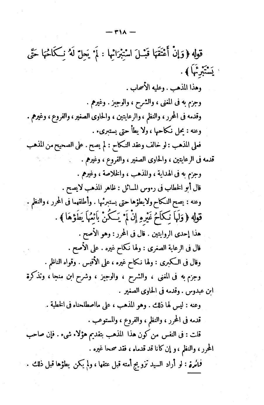قَوْلُهُ (وَإِنْ أَعْتَقَهَا قَبْلَ اسْتِبْرَائِهَا: لَمْ يَحِلَّ لَهُ نِكَاحُهَا حَتَّى يَسْتَبْرِئَهَا) . وَهَذَا الْمَذْهَبُ. وَعَلَيْهِ الْأَصْحَابُ. وَجَزَمَ بِهِ فِي الْمُغْنِي، وَالشَّرْحِ، وَالْوَجِيزِ. وَغَيْرِهِمْ. وَقَدَّمَهُ فِي الْمُحَرَّرِ، وَالنَّظْمِ، وَالرِّعَايَتَيْنِ، وَالْحَاوِي الصَّغِيرِ، وَالْفُرُوعِ، وَغَيْرِهِمْ. وَعَنْهُ: يَحِلُّ نِكَاحُهَا، وَلَا يَطَأُ حَتَّى يَسْتَبْرِئَ. فَعَلَى الْمَذْهَبِ: لَوْ خَالَفَ وَعَقَدَ النِّكَاحَ لَمْ يَصِحَّ. عَلَى الصَّحِيحِ مِنْ الْمَذْهَبِ قَدَّمَهُ فِي الرِّعَايَتَيْنِ، وَالْحَاوِي الصَّغِيرِ، وَالْفُرُوعِ، وَغَيْرِهِمْ. وَجَزَمَ بِهِ فِي الْهِدَايَةِ، وَالْمُذْهَبِ، وَالْخُلَاصَةِ، وَغَيْرِهِمْ. قَالَ أَبُو الْخَطَّابِ فِي رُءُوسِ الْمَسَائِلِ: ظَاهِرُ الْمَذْهَبِ لَا يَصِحُّ. وَعَنْهُ: يَصِحُّ النِّكَاحُ وَلَا يَطَؤُهَا حَتَّى يَسْتَبْرِئَهَا. وَأَطْلَقَهُمَا فِي الْمُحَرَّرِ، وَالنَّظْمِ.