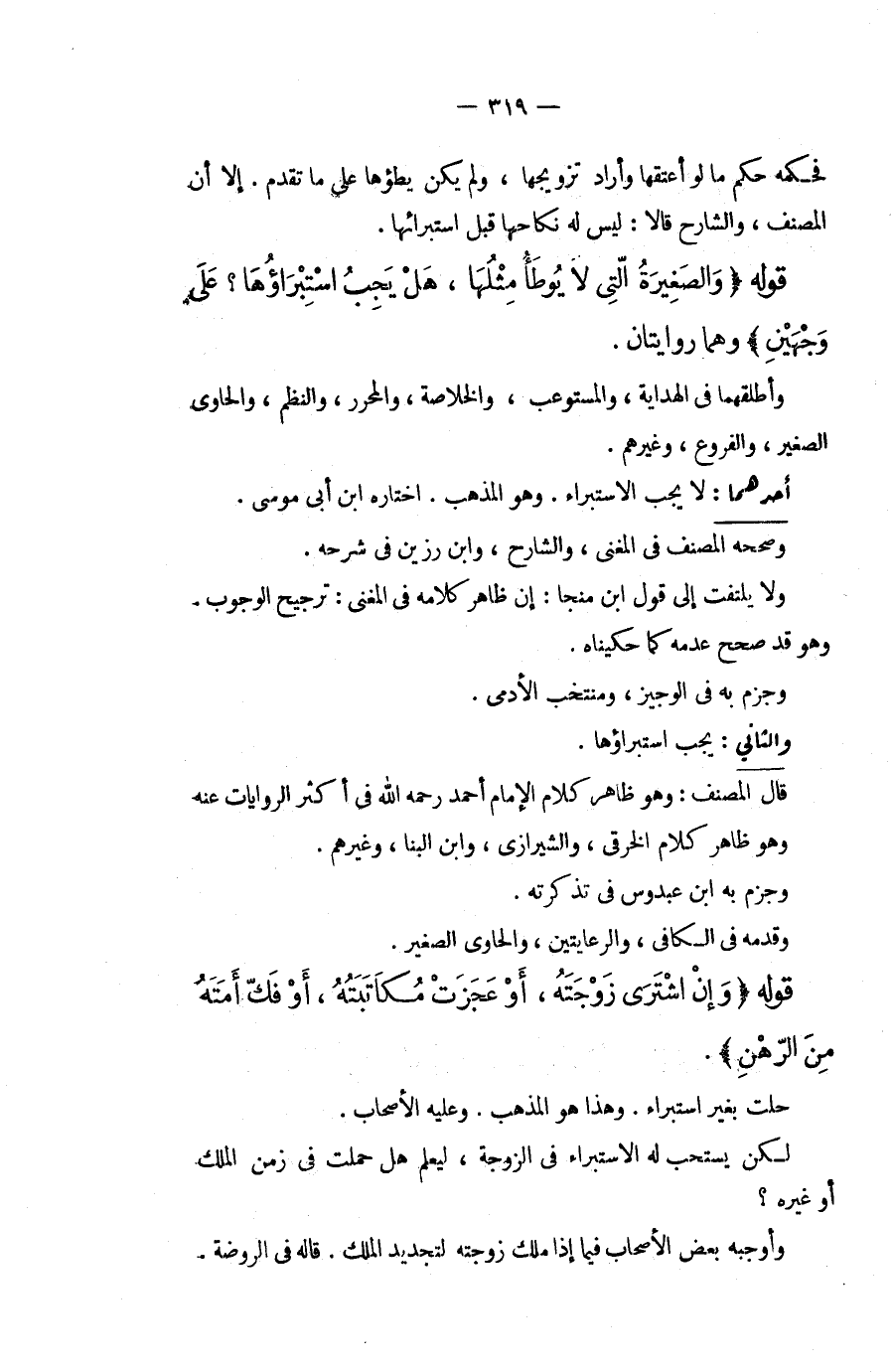 وَالثَّانِي: يَجِبُ اسْتِبْرَاؤُهَا. قَالَ الْمُصَنِّفُ: وَهُوَ ظَاهِرُ كَلَامِ الْإِمَامِ أَحْمَدَ - رَحِمَهُ اللَّهُ - فِي أَكْثَرِ الرِّوَايَاتِ عَنْهُ. وَهُوَ ظَاهِرُ كَلَامِ الْخِرَقِيِّ، وَالشِّيرَازِيِّ، وَابْنِ الْبَنَّا، وَغَيْرِهِمْ. وَجَزَمَ بِهِ ابْنُ عَبْدُوسٍ فِي تَذْكِرَتِهِ. وَقَدَّمَهُ فِي الْكَافِي، وَالرِّعَايَتَيْنِ، وَالْحَاوِي الصَّغِيرِ.