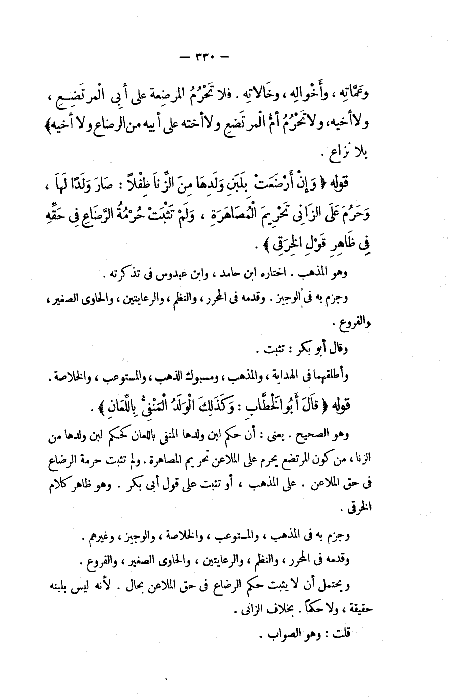 قَوْلُهُ (وَإِنْ أَرْضَعَتْ بِلَبَنِ وَلَدِهَا مِنْ الزِّنَا طِفْلًا: صَارَ وَلَدًا لَهَا، وَحَرُمَ عَلَى الزَّانِي تَحْرِيمَ الْمُصَاهَرَةِ، وَلَمْ تَثْبُتْ حُرْمَةُ الرَّضَاعِ فِي حَقِّهِ فِي ظَاهِرِ قَوْلِ الْخِرَقِيِّ) . وَهُوَ الْمَذْهَبُ. اخْتَارَهُ ابْنُ حَامِدٍ، وَابْنُ عَبْدُوسٍ فِي تَذْكِرَتِهِ. وَجَزَمَ بِهِ فِي الْوَجِيزِ. وَقَدَّمَهُ فِي الْمُحَرَّرِ، وَالنَّظْمِ، وَالرِّعَايَتَيْنِ، وَالْحَاوِي الصَّغِيرِ، وَالْفُرُوعِ. وَقَالَ أَبُو بَكْرٍ: تَثْبُتُ. وَأَطْلَقَهُمَا فِي الْهِدَايَةِ، وَالْمُذْهَبِ، وَمَسْبُوكِ الذَّهَبِ، وَالْمُسْتَوْعِبِ، وَالْخُلَاصَةِ.