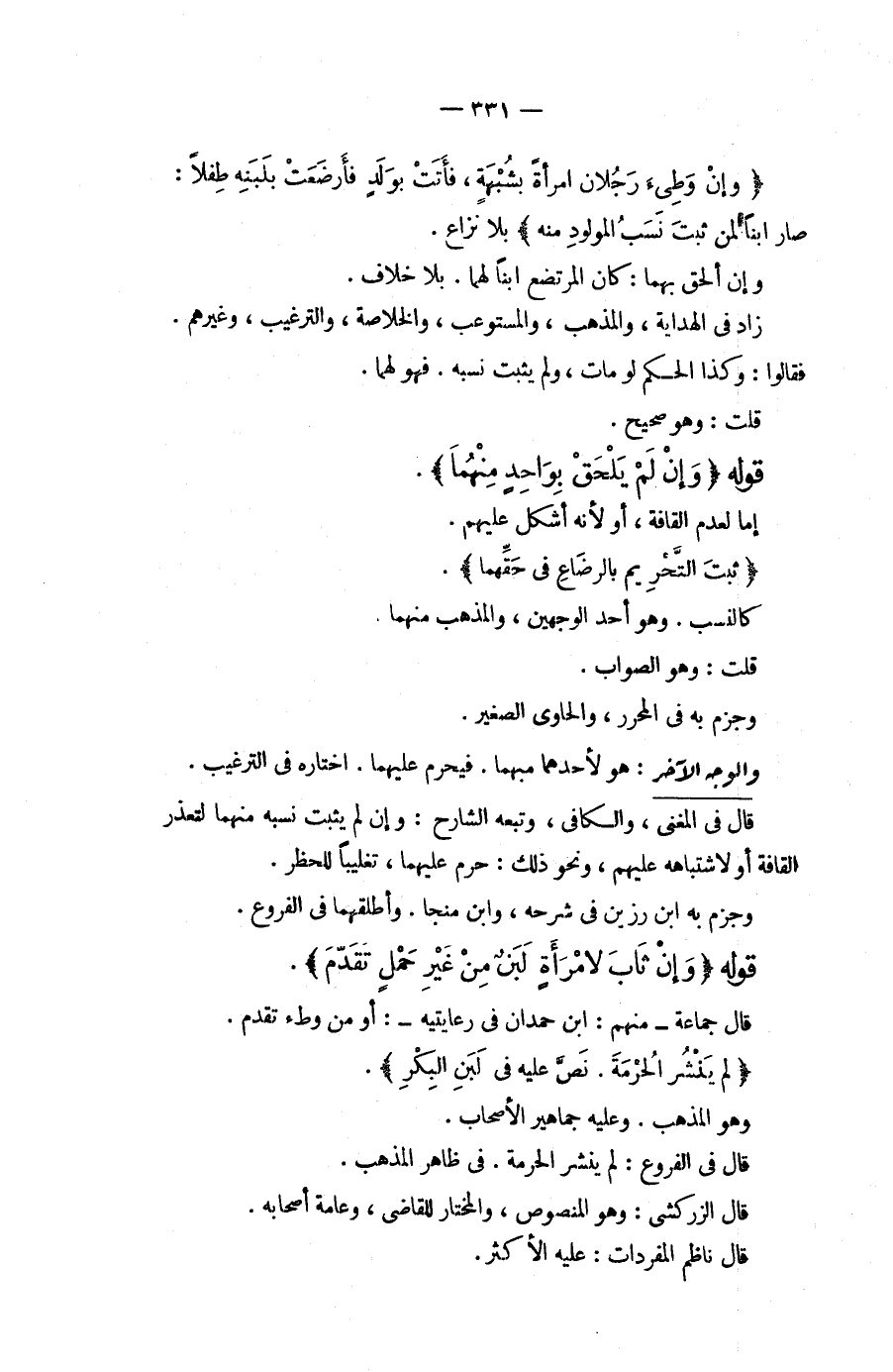 وَالْوَجْهُ الْآخَرُ: هُوَ لِأَحَدِهِمَا مُبْهَمًا. فَيَحْرُمُ عَلَيْهِمَا. اخْتَارَهُ فِي التَّرْغِيبِ. قَالَ فِي الْمُغْنِي، وَالْكَافِي، وَتَبِعَهُ الشَّارِحُ: وَإِنْ لَمْ يَثْبُتْ نَسَبُهُ مِنْهُمَا لِتَعَذُّرِ الْقَافَةِ أَوْ لِاشْتِبَاهِهِ عَلَيْهِمْ، وَنَحْوِ ذَلِكَ: حَرُمَ عَلَيْهِمَا، تَغْلِيبًا لِلْحَظْرِ. وَجَزَمَ بِهِ ابْنُ رَزِينٍ فِي شَرْحِهِ، وَابْنُ مُنَجَّا. وَأَطْلَقَهُمَا فِي الْفُرُوعِ.