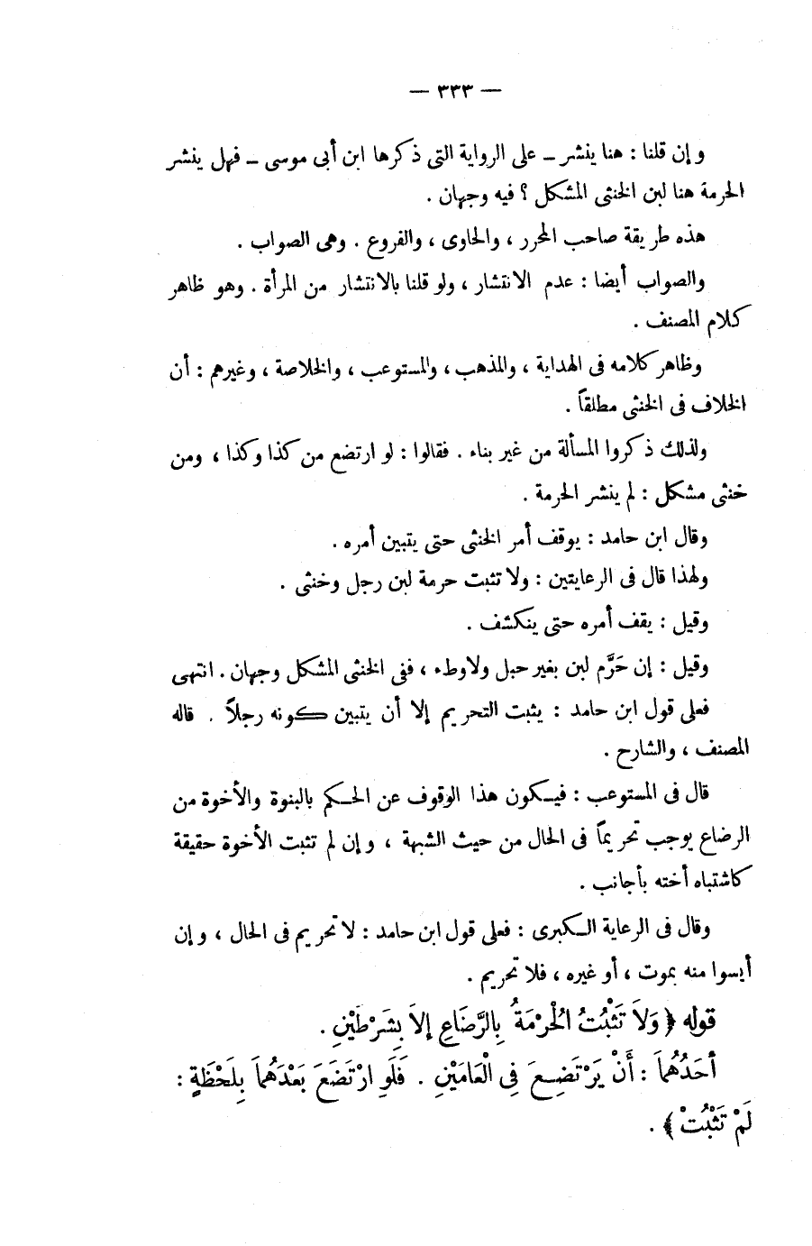 وَإِنْ قُلْنَا: هُنَا يَنْشُرُ عَلَى الرِّوَايَةِ الَّتِي ذَكَرَهَا ابْنُ أَبِي مُوسَى فَهَلْ يَنْشُرُ الْحُرْمَةَ هُنَا لَبَنُ الْخُنْثَى الْمُشْكِلِ؟ فِيهِ وَجْهَانِ. هَذِهِ طَرِيقَةُ صَاحِبِ الْمُحَرَّرِ، وَالْحَاوِي، وَالْفُرُوعِ. وَهِيَ الصَّوَابُ. وَالصَّوَابُ أَيْضًا: عَدَمُ الِانْتِشَارِ، وَلَوْ قُلْنَا بِالِانْتِشَارِ مِنْ الْمَرْأَةِ. وَهُوَ ظَاهِرُ كَلَامِ الْمُصَنِّفِ. وَظَاهِرُ كَلَامِهِ فِي الْهِدَايَةِ، وَالْمُذْهَبِ، وَالْمُسْتَوْعِبِ، وَالْخُلَاصَةِ، وَغَيْرِهِمْ: أَنَّ الْخِلَافَ فِي الْخُنْثَى مُطْلَقًا. وَلِذَلِكَ ذَكَرُوا الْمَسْأَلَةَ مِنْ غَيْرِ بِنَاءٍ. فَقَالُوا: لَوْ ارْتَضَعَ مِنْ كَذَا وَكَذَا، وَمِنْ خُنْثَى مُشْكِلٍ: لَمْ يَنْشُرْ الْحُرْمَةَ. وَقَالَ ابْنُ حَامِدٍ: يُوقَفُ أَمْرُ الْخُنْثَى حَتَّى يَتَبَيَّنَ أَمْرُهُ. وَلِهَذَا قَالَ فِي الرِّعَايَتَيْنِ: وَلَا تَثْبُتُ حُرْمَةُ لَبَنِ رَجُلٍ وَخُنْثَى. وَقِيلَ: يَقِفُ أَمْرُهُ حَتَّى يَنْكَشِفَ. وَقِيلَ: إنْ حَرُمَ لَبَنٌ بِغَيْرِ حَبَلٍ وَلَا وَطْءٍ، فَفِي الْخُنْثَى الْمُشْكِلِ وَجْهَانِ. انْتَهَى فَعَلَى قَوْلِ ابْنِ حَامِدٍ: يَثْبُتُ التَّحْرِيمُ إلَّا أَنْ يَتَبَيَّنَ كَوْنُهُ رَجُلًا. قَالَهُ الْمُصَنِّفُ، وَالشَّارِحُ. قَالَ فِي الْمُسْتَوْعِبِ: فَيَكُونُ هَذَا الْوُقُوفُ عَنْ الْحُكْمِ بِالْبُنُوَّةِ وَالْأُخُوَّةِ مِنْ الرَّضَاعِ يُوجِبُ تَحْرِيمًا فِي الْحَالِ مِنْ حَيْثُ الشُّبْهَةُ، وَإِنْ لَمْ تَثْبُتْ الْأُخُوَّةُ حَقِيقَةً كَاشْتِبَاهِ أُخْتِهِ بِأَجَانِبَ. وَقَالَ فِي الرِّعَايَةِ الْكُبْرَى: فَعَلَى قَوْلِ ابْنِ حَامِدٍ: لَا تَحْرِيمَ فِي الْحَالِ، وَإِنْ أَيِسُوا مِنْهُ بِمَوْتٍ، أَوْ غَيْرِهِ، فَلَا تَحْرِيمَ.