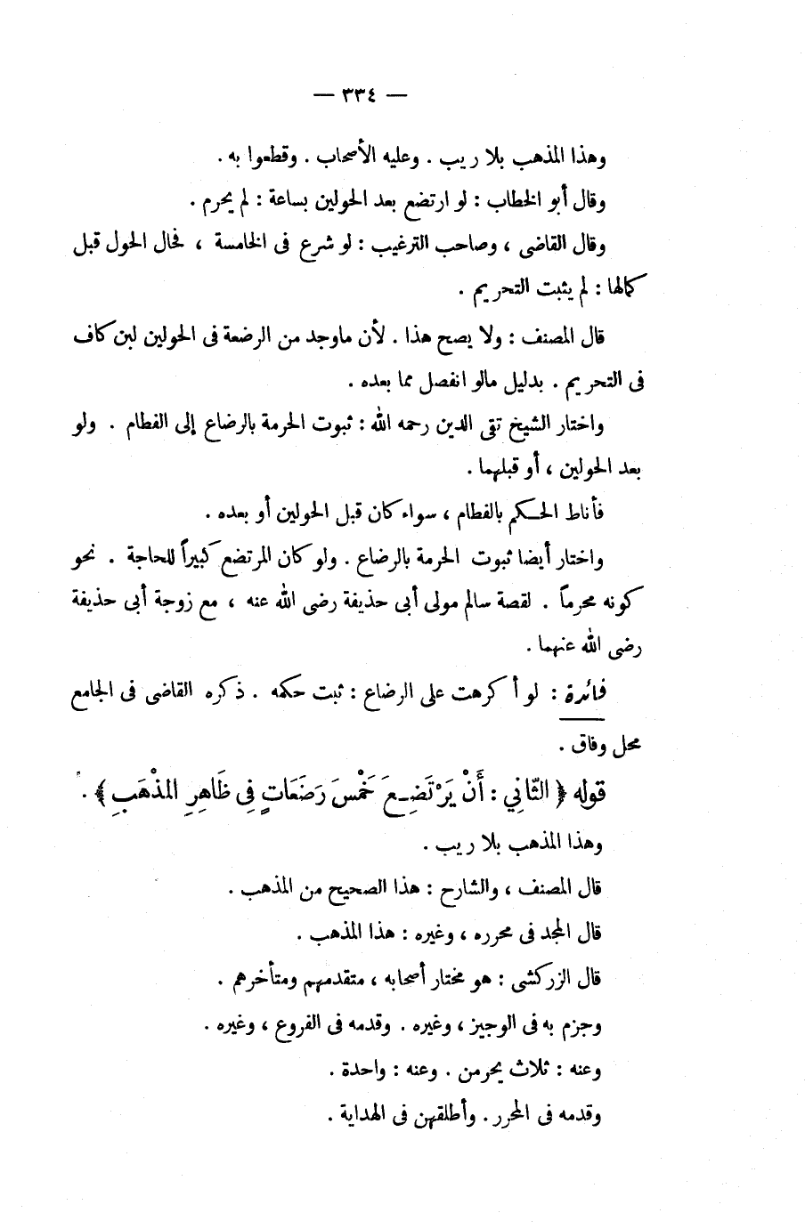 وَهَذَا الْمَذْهَبُ بِلَا رَيْبٍ. وَعَلَيْهِ الْأَصْحَابُ. وَقَطَعُوا بِهِ. وَقَالَ أَبُو الْخَطَّابِ: لَوْ ارْتَضَعَ بَعْدَ الْحَوْلَيْنِ بِسَاعَةٍ: لَمْ يَحْرُمْ. وَقَالَ الْقَاضِي، وَصَاحِبُ التَّرْغِيبِ: لَوْ شَرَعَ فِي الْخَامِسَةِ، فَحَالَ الْحَوْلُ قَبْلَ كَمَالِهَا: لَمْ يَثْبُتْ التَّحْرِيمُ. قَالَ الْمُصَنِّفُ: وَلَا يَصِحُّ هَذَا. لِأَنَّ مَا وُجِدَ مِنْ الرَّضْعَةِ فِي الْحَوْلَيْنِ لَبَنٌ كَافٍ فِي التَّحْرِيمِ. بِدَلِيلِ مَا لَوْ انْفَصَلَ مِمَّا بَعْدَهُ. وَاخْتَارَ الشَّيْخُ تَقِيُّ الدِّينِ - رَحِمَهُ اللَّهُ -: ثُبُوتَ الْحُرْمَةِ بِالرَّضَاعِ إلَى الْفِطَامِ. وَلَوْ بَعْدَ الْحَوْلَيْنِ، أَوْ قَبْلَهُمَا. فَأَنَاطَ الْحُكْمَ بِالْفِطَامِ، سَوَاءٌ كَانَ قَبْلَ الْحَوْلَيْنِ أَوْ بَعْدَهُ. وَاخْتَارَ أَيْضًا ثُبُوتَ الْحُرْمَةِ بِالرَّضَاعِ. وَلَوْ كَانَ الْمُرْتَضِعُ كَبِيرًا لِلْحَاجَةِ. نَحْوَ كَوْنِهِ مُحَرَّمًا. لِقِصَّةِ سَالِمِ مَوْلَى أَبِي حُذَيْفَةَ - رَضِيَ اللَّهُ عَنْهُ -، مَعَ زَوْجَةِ أَبِي حُذَيْفَةَ - رَضِيَ اللَّهُ عَنْهُمَا -.