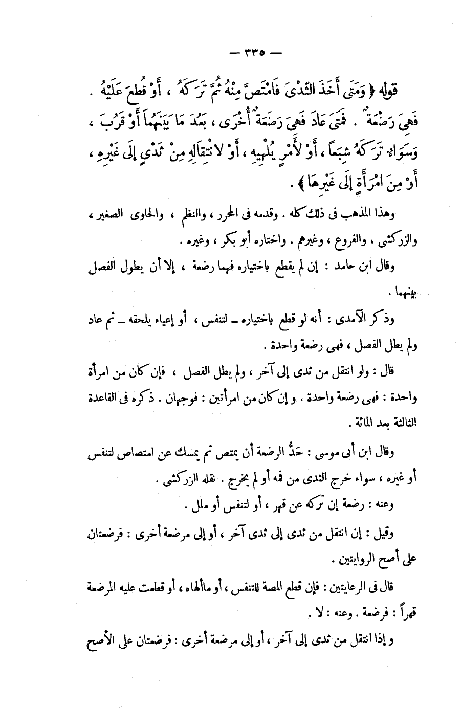 قَوْلُهُ (وَمَتَى أَخَذَ الثَّدْيَ فَامْتَصَّ مِنْهُ ثُمَّ تَرَكَهُ، أَوْ قُطِعَ عَلَيْهِ. فَهِيَ رَضْعَةٌ. فَمَتَى عَادَ فَهِيَ رَضْعَةٌ أُخْرَى، بَعُدَ مَا بَيْنَهُمَا أَوْ قَرُبَ، وَسَوَاءٌ تَرَكَهُ شِبَعًا، أَوْ لِأَمْرٍ يُلْهِيه، أَوْ لِانْتِقَالِهِ مِنْ ثَدْيٍ إلَى غَيْرِهِ، أَوْ مِنْ امْرَأَةٍ إلَى غَيْرِهَا) . وَهَذَا الْمَذْهَبُ فِي ذَلِكَ كُلِّهِ. وَقَدَّمَهُ فِي الْمُحَرَّرِ، وَالنَّظْمِ، وَالْحَاوِي الصَّغِيرِ، وَالزَّرْكَشِيِّ، وَالْفُرُوعِ، وَغَيْرِهِمْ. وَاخْتَارَهُ أَبُو بَكْرٍ، وَغَيْرُهُ. وَقَالَ ابْنُ حَامِدٍ: إنْ لَمْ يَقْطَعْ بِاخْتِيَارِهِ فَهُمَا رَضْعَةٌ، إلَّا أَنْ يَطُولَ الْفَصْلُ بَيْنَهُمَا. وَذَكَرَ الْآمِدِيُّ: أَنَّهُ لَوْ قَطَعَ بِاخْتِيَارِهِ لِتَنَفُّسٍ، أَوْ إعْيَاءٍ يَلْحَقُهُ ثُمَّ عَادَ وَلَمْ يَطُلْ الْفَصْلُ، فَهِيَ رَضْعَةٌ وَاحِدَةٌ. قَالَ: وَلَوْ انْتَقَلَ مِنْ ثَدْيٍ إلَى آخَرَ، وَلَمْ يَطُلْ الْفَصْلُ، فَإِنْ كَانَ مِنْ امْرَأَةٍ وَاحِدَةٍ: فَهِيَ رَضْعَةٌ وَاحِدَةٌ. وَإِنْ كَانَ مِنْ امْرَأَتَيْنِ: فَوَجْهَانِ. ذَكَرَهُ فِي الْقَاعِدَةِ الثَّالِثَةِ بَعْدَ الْمِائَةِ. وَقَالَ ابْنُ أَبِي مُوسَى: حَدُّ الرَّضْعَةِ أَنْ يَمْتَصَّ ثُمَّ يُمْسِكَ عَنْ امْتِصَاصِ لِتَنَفُّسٍ أَوْ غَيْرِهِ، سَوَاءٌ خَرَجَ الثَّدْيُ مِنْ فَمِهِ أَوْ لَمْ يَخْرُجْ. نَقَلَهُ الزَّرْكَشِيُّ. وَعَنْهُ: رَضْعَةٌ إنْ تَرَكَهُ عَنْ قَهْرٍ، أَوْ لِتَنَفُّسٍ أَوْ مَلَلٍ. وَقِيلَ: إنْ انْتَقَلَ مِنْ ثَدْيٍ إلَى ثَدْيٍ آخَرَ، أَوْ إلَى مُرْضِعَةٍ أُخْرَى: فَرَضْعَتَانِ عَلَى أَصَحِّ الرِّوَايَتَيْنِ. قَالَ فِي الرِّعَايَتَيْنِ: فَإِنْ قَطَعَ الْمَصَّةَ لِلتَّنَفُّسِ، أَوْ مَا أَلْهَاهُ، أَوْ قَطَعَتْ عَلَيْهِ الْمُرْضِعَةُ قَهْرًا: فَرَضْعَةٌ. وَعَنْهُ: لَا. وَإِذَا انْتَقَلَ مِنْ ثَدْيٍ إلَى آخَرَ، أَوْ إلَى مُرْضِعَةٍ أُخْرَى: فَرَضْعَتَانِ عَلَى الْأَصَحِّ