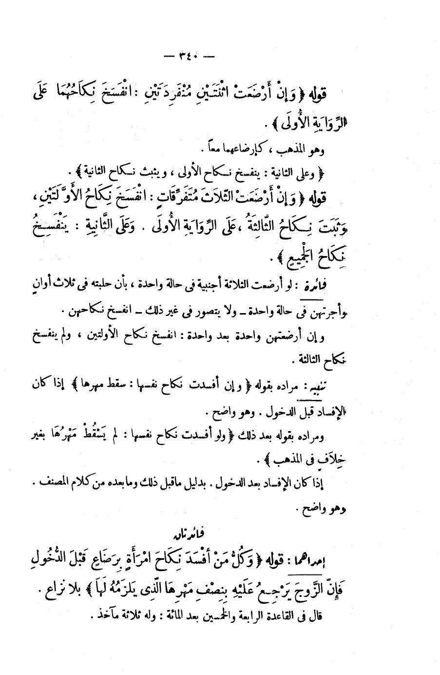 مُرَادُهُ بِقَوْلِهِ (وَإِنْ أَفْسَدَتْ نِكَاحَ نَفْسِهَا: يَسْقُطُ مَهْرُهَا) إذَا كَانَ الْإِفْسَادُ قَبْلَ الدُّخُولِ. وَهُوَ وَاضِحٌ. وَمُرَادُهُ بِقَوْلِهِ بَعْدَ ذَلِكَ (وَلَوْ أَفْسَدَتْ نِكَاحَ نَفْسِهَا: لَمْ يَسْقُطْ مَهْرُهَا بِغَيْرِ خِلَافٍ فِي الْمَذْهَبِ) . إذَا كَانَ الْإِفْسَادُ بَعْدَ الدُّخُولِ. بِدَلِيلِ مَا قَبْلَ ذَلِكَ وَمَا بَعْدَهُ مِنْ كَلَامِ الْمُصَنِّفِ. وَهُوَ وَاضِحٌ. فَائِدَتَانِ
