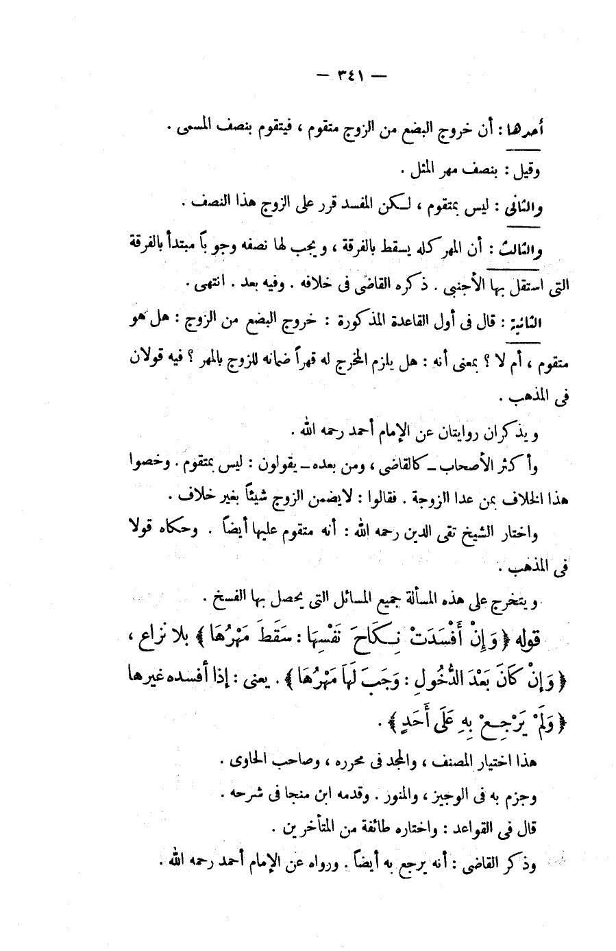 الثَّانِيَةُ: قَالَ فِي أَوَّلِ الْقَاعِدَةِ الْمَذْكُورَةِ: خُرُوجُ الْبُضْعِ مِنْ الزَّوْجِ: هَلْ هُوَ مُتَقَوِّمٌ، أَمْ لَا؟ بِمَعْنَى أَنَّهُ: هَلْ يَلْزَمُ الْمُخْرِجَ لَهُ قَهْرًا ضَمَانُهُ لِلزَّوْجِ بِالْمَهْرِ؟ فِيهِ قَوْلَانِ فِي الْمَذْهَبِ. وَيُذْكَرَانِ رِوَايَتَانِ عَنْ الْإِمَامِ أَحْمَدَ - رَحِمَهُ اللَّهُ -. وَأَكْثَرِ الْأَصْحَابِ كَالْقَاضِي، وَمَنْ بَعْدَهُ يَقُولُونَ: لَيْسَ بِمُتَقَوِّمٍ. وَخَصُّوا هَذَا الْخِلَافَ بِمَنْ عَدَا الزَّوْجَةَ. فَقَالُوا: لَا يَضْمَنُ الزَّوْجُ شَيْئًا بِغَيْرِ خِلَافٍ. وَاخْتَارَ الشَّيْخُ تَقِيُّ الدِّينِ - رَحِمَهُ اللَّهُ -: أَنَّهُ مُتَقَوِّمٌ عَلَيْهَا أَيْضًا. وَحَكَاهُ قَوْلًا فِي الْمَذْهَبِ. وَيَتَخَرَّجُ عَلَى هَذِهِ الْمَسْأَلَةِ جَمِيعُ الْمَسَائِلِ الَّتِي يَحْصُلُ بِهَا الْفَسْخُ.