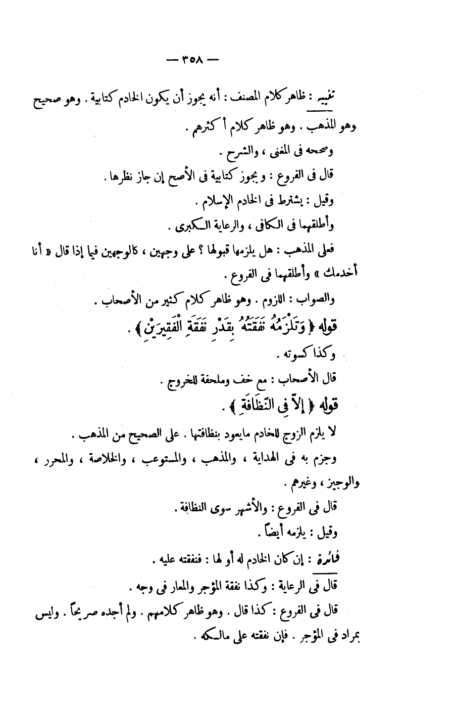 ظَاهِرُ كَلَامِ الْمُصَنِّفِ: أَنَّهُ يَجُوزُ أَنْ يَكُونَ الْخَادِمُ كِتَابِيَّةً. وَهُوَ صَحِيحٌ وَهُوَ الْمَذْهَبُ. وَهُوَ ظَاهِرُ كَلَامِ أَكْثَرِهِمْ. وَصَحَّحَهُ فِي الْمُغْنِي، وَالشَّرْحِ. قَالَ فِي الْفُرُوعِ: وَيَجُوزُ كِتَابِيَّةٌ فِي الْأَصَحِّ إنْ جَازَ نَظَرُهَا. وَقِيلَ: يُشْتَرَطُ فِي الْخَادِمِ الْإِسْلَامُ. وَأَطْلَقَهُمَا فِي الْكَافِي، وَالرِّعَايَةِ الْكُبْرَى. فَعَلَى الْمَذْهَبِ: هَلْ يَلْزَمُهَا قَبُولُهَا؟ عَلَى وَجْهَيْنِ، كَالْوَجْهَيْنِ فِيمَا إذَا قَالَ " أَنَا أَخْدُمُك " وَأَطْلَقَهُمَا فِي الْفُرُوعِ. وَالصَّوَابُ: اللُّزُومُ. وَهُوَ ظَاهِرُ كَلَامِ كَثِيرٍ مِنْ الْأَصْحَابِ.