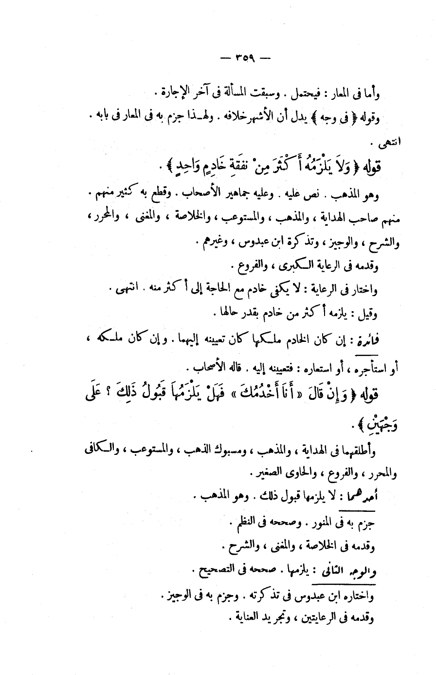 وَقَوْلُهُ (فِي وَجْهٍ) يَدُلُّ أَنَّ الْأَشْهَرَ خِلَافُهُ. وَلِهَذَا جَزَمَ بِهِ فِي الْمُعَارِ فِي بَابِهِ. انْتَهَى. قَوْلُهُ (وَلَا يَلْزَمُهُ أَكْثَرُ مِنْ نَفَقَةِ خَادِمٍ وَاحِدٍ) . وَهُوَ الْمَذْهَبُ. نَصَّ عَلَيْهِ. وَعَلَيْهِ جَمَاهِيرُ الْأَصْحَابِ. وَقَطَعَ بِهِ كَثِيرٌ مِنْهُمْ. مِنْهُمْ صَاحِبُ الْهِدَايَةِ، وَالْمُذْهَبِ، وَالْمُسْتَوْعِبِ، وَالْخُلَاصَةِ، وَالْمُغْنِي، وَالْمُحَرَّرِ، وَالشَّرْحِ، وَالْوَجِيزِ، وَتَذْكِرَةِ ابْنِ عَبْدُوسٍ، وَغَيْرِهِمْ. وَقَدَّمَهُ فِي الرِّعَايَةِ الْكُبْرَى، وَالْفُرُوعِ. وَاخْتَارَ فِي الرِّعَايَةِ: لَا يَكْفِي خَادِمٌ مَعَ الْحَاجَةِ إلَى أَكْثَرَ مِنْهُ. انْتَهَى. وَقِيلَ: يَلْزَمُهُ أَكْثَرُ مِنْ خَادِمٍ بِقَدْرِ حَالِهَا.