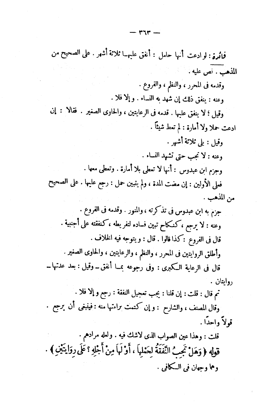 لَوْ ادَّعَتْ أَنَّهَا حَامِلٌ: أَنْفَقَ عَلَيْهَا ثَلَاثَةَ أَشْهُرٍ. عَلَى الصَّحِيحِ مِنْ الْمَذْهَبِ. نَصَّ عَلَيْهِ. وَقَدَّمَهُ فِي الْمُحَرَّرِ، وَالنَّظْمِ، وَالْفُرُوعِ. وَعَنْهُ: يُنْفِقُ ذَلِكَ إنْ شَهِدَ بِهِ النِّسَاءُ. وَإِلَّا فَلَا. وَقِيلَ؛ لَا يُنْفِقُ عَلَيْهَا. قَدَّمَهُ فِي الرِّعَايَتَيْنِ، وَالْحَاوِي الصَّغِيرِ. فَقَالَا: إنْ ادَّعَتْ حَمْلًا وَلَا أَمَارَةَ: لَمْ تُعْطَ شَيْئًا. وَقِيلَ: بَلَى ثَلَاثَةَ أَشْهُرٍ. وَعَنْهُ: لَا تَجِبُ حَتَّى تَشْهَدَ النِّسَاءُ. وَجَزَمَ ابْنُ عَبْدُوسٍ: أَنَّهَا لَا تُعْطَى بِلَا أَمَارَةٍ. وَتُعْطَى مَعَهَا. فَعَلَى الْأَوَّلَيْنِ: إنْ مَضَتْ الْمُدَّةُ، وَلَمْ يَتَبَيَّنْ حَمْلٌ: رَجَعَ عَلَيْهَا. عَلَى الصَّحِيحِ مِنْ الْمَذْهَبِ. جَزَمَ بِهِ ابْنُ عَبْدُوسٍ فِي تَذْكِرَتِهِ، وَالْمُنَوِّرِ. وَقَدَّمَهُ فِي الْفُرُوعِ. وَعَنْهُ: لَا يَرْجِعُ كَنِكَاحٍ تَبَيَّنَ فَسَادُهُ لِتَفْرِيطِهِ كَنَفَقَتِهِ عَلَى أَجْنَبِيَّةٍ. قَالَ فِي الْفُرُوعِ: كَذَا قَالُوا. قَالَ: وَيَتَوَجَّهُ فِيهِ الْخِلَافُ. وَأَطْلَقَ الرِّوَايَتَيْنِ فِي الْمُحَرَّرِ، وَالنَّظْمِ، وَالرِّعَايَتَيْنِ، وَالْحَاوِي الصَّغِيرِ. قَالَ فِي الرِّعَايَةِ الْكُبْرَى: وَفِي رُجُوعِهِ بِمَا أَنْفَقَ وَقِيلَ: بَعْدَ عِدَّتِهَا رِوَايَتَانِ. ثُمَّ قَالَ: قُلْت: إنْ قُلْنَا: يَجِبُ تَعْجِيلُ النَّفَقَةِ: رَجَعَ وَإِلَّا فَلَا. وَقَالَ الْمُصَنِّفُ، وَالشَّارِحُ: وَإِنْ كَتَمَتْ بَرَاءَتَهَا مِنْهُ: فَيَنْبَغِي أَنْ يَرْجِعَ. قَوْلًا وَاحِدًا. قُلْت: وَهَذَا عَيْنُ الصَّوَابِ الَّذِي لَا شَكَّ فِيهِ. وَلَعَلَّهُ مُرَادُهُمْ.