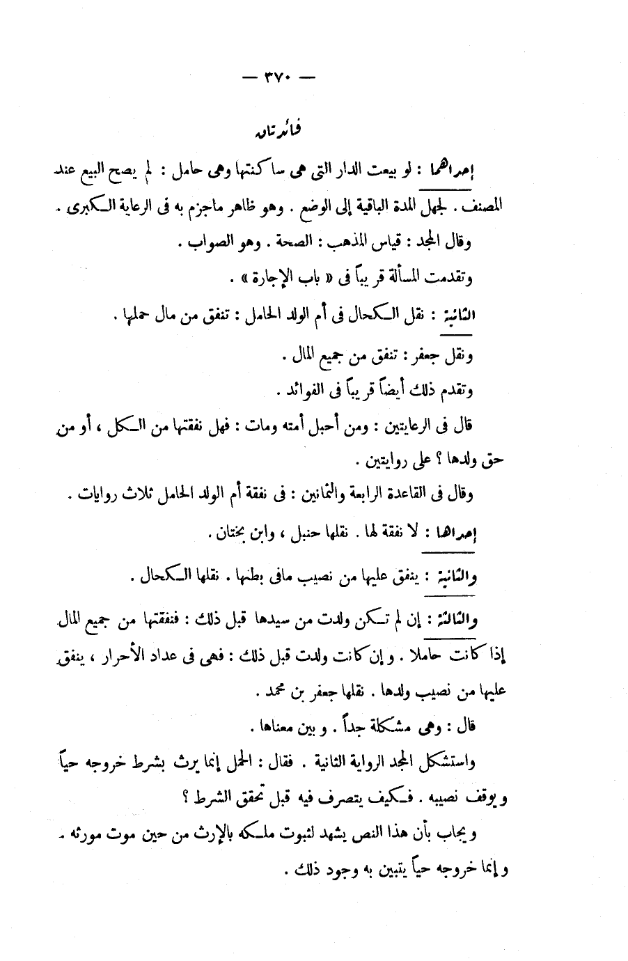 الثَّانِيَةُ: نَقَلَ الْكَحَّالُ فِي أُمِّ الْوَلَدِ الْحَامِلِ: تُنْفِقُ مِنْ مَالِ حَمْلِهَا. وَنَقَلَ جَعْفَرٌ: تُنْفِقُ مِنْ جَمِيعِ الْمَالِ. وَتَقَدَّمَ ذَلِكَ أَيْضًا قَرِيبًا فِي الْفَوَائِدِ. قَالَ فِي الرِّعَايَتَيْنِ: وَمَنْ أَحْبَلَ أَمَتَهُ وَمَاتَ: فَهَلْ نَفَقَتُهَا مِنْ الْكُلِّ، أَوْ مِنْ حَقِّ وَلَدِهَا؟ عَلَى رِوَايَتَيْنِ. وَقَالَ فِي الْقَاعِدَةِ الرَّابِعَةِ وَالثَّمَانِينَ: فِي نَفَقَةِ أُمِّ الْوَلَدِ الْحَامِلِ ثَلَاثُ رِوَايَاتٍ.