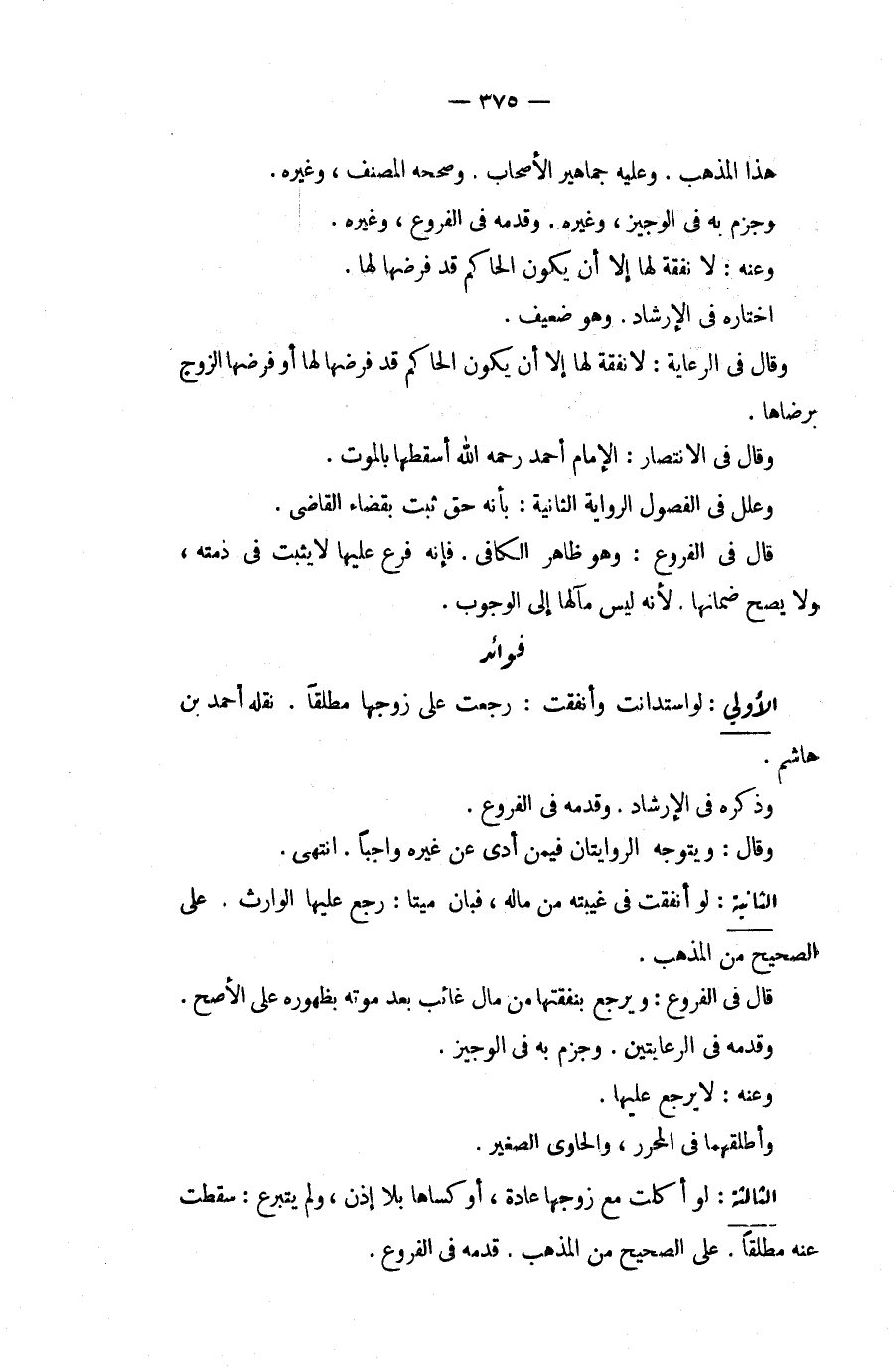 الْأُولَى: لَوْ اسْتَدَانَتْ وَأَنْفَقَتْ: رَجَعَتْ عَلَى زَوْجِهَا مُطْلَقًا نَقَلَهُ أَحْمَدُ بْنُ هَاشِمٍ. وَذَكَرَهُ فِي الْإِرْشَادِ. وَقَدَّمَهُ فِي الْفُرُوعِ. وَقَالَ: وَيَتَوَجَّهُ الرِّوَايَتَانِ فِيمَنْ أَدَّى عَنْ غَيْرِهِ وَاجِبًا. انْتَهَى.