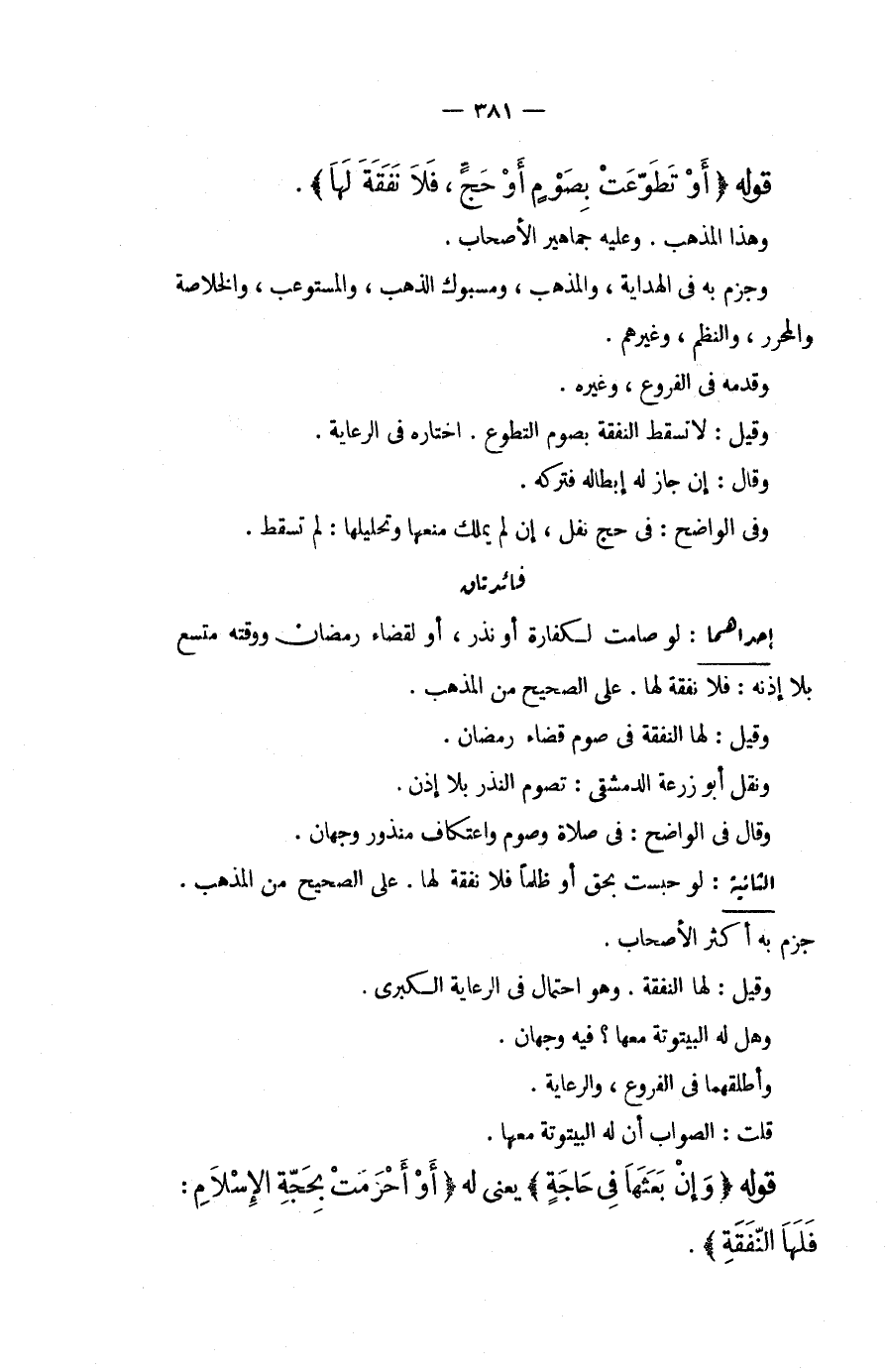 إحْدَاهُمَا: لَوْ صَامَتْ لِكَفَّارَةٍ أَوْ نَذْرٍ، أَوْ لِقَضَاءِ رَمَضَانَ وَوَقْتُهُ مُتَّسِعٌ بِلَا إذْنِهِ: فَلَا نَفَقَةَ لَهَا. عَلَى الصَّحِيحِ مِنْ الْمَذْهَبِ. وَقِيلَ: لَهَا النَّفَقَةُ فِي صَوْمِ قَضَاءِ رَمَضَانَ. وَنَقَلَ أَبُو زُرْعَةَ الدِّمَشْقِيُّ: تَصُومُ النَّذْرَ بِلَا إذْنٍ. وَقَالَ فِي الْوَاضِحِ: فِي صَلَاةٍ وَصَوْمٍ وَاعْتِكَافٍ مَنْذُورٍ وَجْهَانِ.