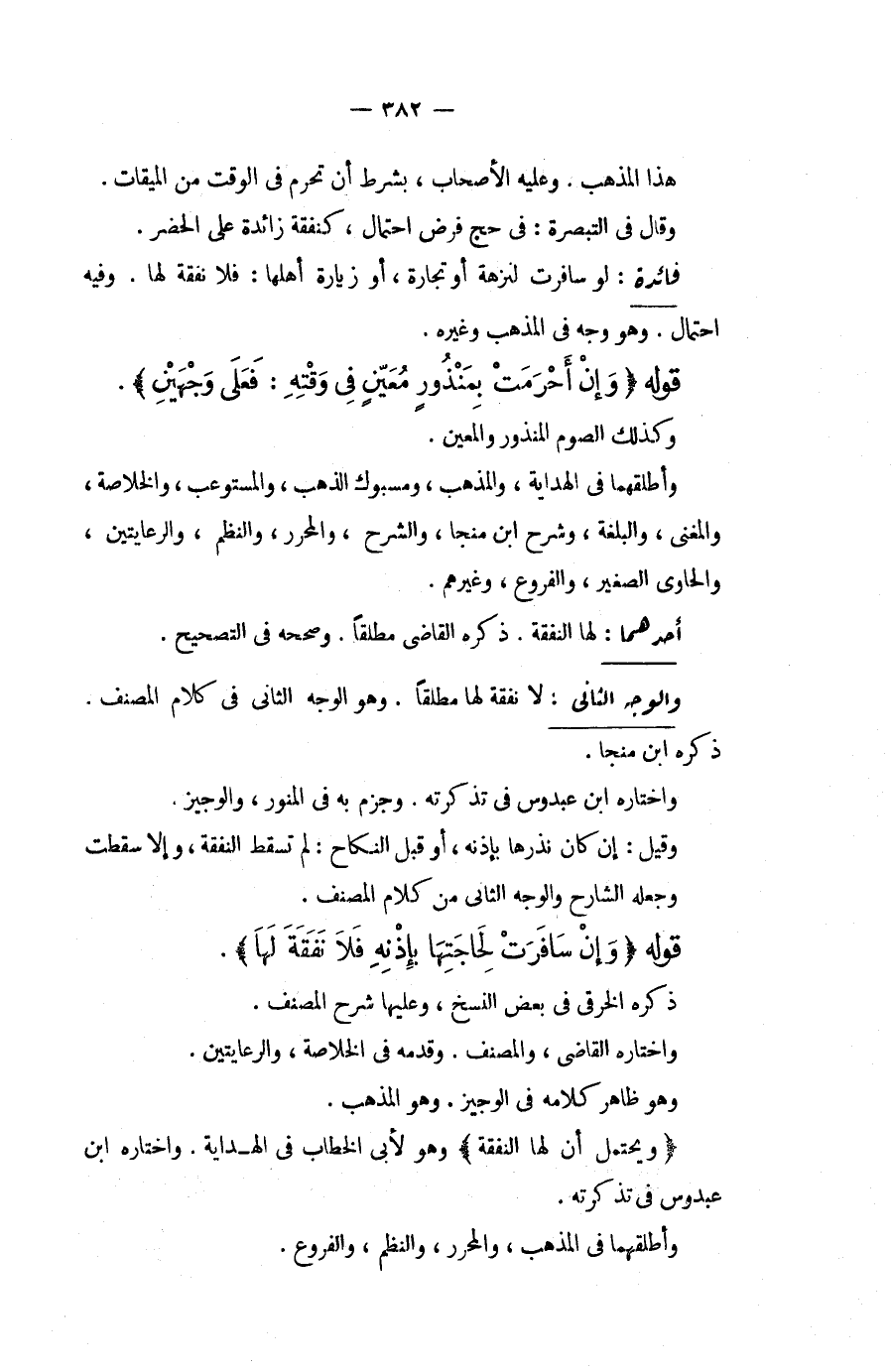 وَالْوَجْهُ الثَّانِي: لَا نَفَقَةَ لَهَا مُطْلَقًا. وَهُوَ الْوَجْهُ الثَّانِي فِي كَلَامِ الْمُصَنِّفِ. ذَكَرَهُ ابْنُ مُنَجَّا. وَاخْتَارَهُ ابْنُ عَبْدُوسٍ فِي تَذْكِرَتِهِ. وَجَزَمَ بِهِ فِي الْمُنَوِّرِ، وَالْوَجِيزِ. وَقِيلَ: إنْ كَانَ نَذْرُهَا بِإِذْنِهِ، أَوْ قَبْلَ النِّكَاحِ: لَمْ تَسْقُطْ النَّفَقَةُ، وَإِلَّا سَقَطَتْ وَجَعَلَهُ الشَّارِحُ الْوَجْهَ الثَّانِيَ مِنْ كَلَامِ الْمُصَنِّفِ.