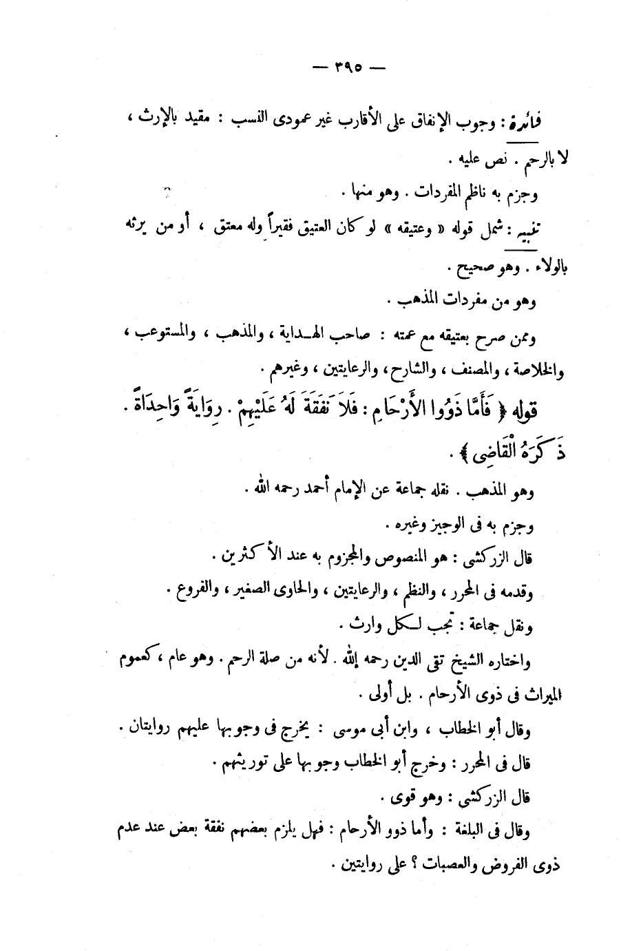 قَوْلُهُ (فَأَمَّا ذَوَوْا الْأَرْحَامِ: فَلَا نَفَقَةَ لَهُ عَلَيْهِمْ. رِوَايَةً وَاحِدَةً. ذَكَرَهُ الْقَاضِي) . وَهُوَ الْمَذْهَبُ. نَقَلَهُ جَمَاعَةٌ عَنْ الْإِمَامِ أَحْمَدَ - رَحِمَهُ اللَّهُ -. وَجَزَمَ بِهِ فِي الْوَجِيزِ وَغَيْرِهِ. قَالَ الزَّرْكَشِيُّ: هُوَ الْمَنْصُوصُ وَالْمَجْزُومُ بِهِ عِنْدَ الْأَكْثَرِينَ. وَقَدَّمَهُ فِي الْمُحَرَّرِ، وَالنَّظْمِ، وَالرِّعَايَتَيْنِ، وَالْحَاوِي الصَّغِيرِ، وَالْفُرُوعِ. وَنَقَلَ جَمَاعَةٌ: تَجِبُ لِكُلِّ وَارِثٍ. وَاخْتَارَهُ الشَّيْخُ تَقِيُّ الدِّينِ - رَحِمَهُ اللَّهُ -. لِأَنَّهُ مِنْ صِلَةِ الرَّحِمِ. وَهُوَ عَامٌّ، كَعُمُومِ الْمِيرَاثِ فِي ذَوِي الْأَرْحَامِ. بَلْ أَوْلَى. وَقَالَ أَبُو الْخَطَّابِ، وَابْنُ أَبِي مُوسَى: يَخْرُجُ فِي وُجُوبِهَا عَلَيْهِمْ رِوَايَتَانِ. قَالَ فِي الْمُحَرَّرِ: وَخَرَّجَ أَبُو الْخَطَّابِ وُجُوبَهَا عَلَى تَوْرِيثِهِمْ. قَالَ الزَّرْكَشِيُّ: وَهُوَ قَوِيٌّ. وَقَالَ فِي الْبُلْغَةِ: وَأَمَّا ذَوُو الْأَرْحَامِ: فَهَلْ يَلْزَمُ بَعْضَهُمْ نَفَقَةُ بَعْضٍ عِنْدَ عَدَمِ ذَوِي الْفُرُوضِ وَالْعَصَبَاتِ؟ عَلَى رِوَايَتَيْنِ.