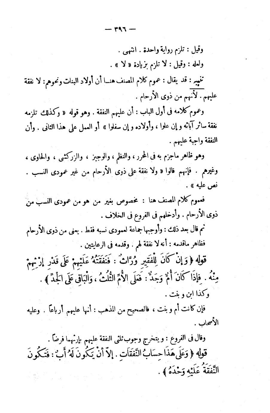 قَدْ يُقَالُ: عُمُومُ كَلَامِ الْمُصَنِّفِ هُنَا أَنَّ أَوْلَادَ الْبَنَاتِ وَنَحْوَهُمْ: لَا نَفَقَةَ عَلَيْهِمْ. لِأَنَّهُمْ مِنْ ذَوِي الْأَرْحَامِ. وَعُمُومُ كَلَامِهِ فِي أَوَّلِ الْبَابِ: أَنَّ عَلَيْهِمْ النَّفَقَةَ. وَهُوَ قَوْلُهُ " وَكَذَلِكَ تَلْزَمُهُ نَفَقَةُ سَائِرِ آبَائِهِ وَإِنْ عَلَوْا، وَأَوْلَادِهِ وَإِنْ سَفَلُوا " أَوْ الْعَمَلُ عَلَى هَذَا الثَّانِي. وَأَنَّ النَّفَقَةَ وَاجِبَةٌ عَلَيْهِمْ. وَهُوَ ظَاهِرُ مَا جَزَمَ بِهِ فِي الْمُحَرَّرِ، وَالنَّظْمِ، وَالْوَجِيزِ، وَالزَّرْكَشِيُّ، وَالْحَاوِي، وَغَيْرِهِمْ. فَإِنَّهُمْ قَالُوا " وَلَا نَفَقَةَ عَلَى ذَوِي الْأَرْحَامِ مِنْ غَيْرِ عَمُودَيْ النَّسَبِ نَصَّ عَلَيْهِ ". فَعُمُومُ كَلَامِ الْمُصَنِّفِ هُنَا: مَخْصُوصٌ بِغَيْرِ مَنْ هُوَ مِنْ عَمُودَيْ النَّسَبِ مِنْ ذَوِي الْأَرْحَامِ. وَأَدْخَلَهُمْ فِي الْفُرُوعِ فِي الْخِلَافِ. ثُمَّ قَالَ بَعْدَ ذَلِكَ: وَأَوْجَبَهَا جَمَاعَةٌ لِعَمُودَيْ نَسَبِهِ فَقَطْ. يَعْنِي مِنْ ذَوِي الْأَرْحَامِ فَظَاهِرُ مَا قَدَّمَهُ: أَنَّهُ لَا نَفَقَةَ لَهُمْ. وَقَدَّمَهُ فِي الرِّعَايَتَيْنِ.