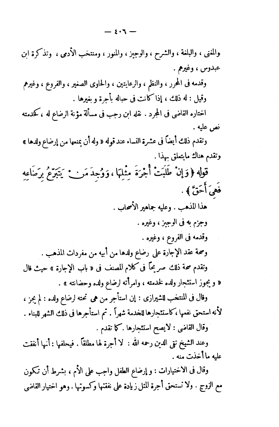 وَالْمُغْنِي، وَالْبُلْغَةِ، وَالشَّرْحِ، وَالْوَجِيزِ، وَالْمُنَوِّرِ، وَمُنْتَخَبِ الْأَدَمِيِّ، وَتَذْكِرَةِ ابْنِ عَبْدُوسٍ، وَغَيْرِهِمْ. وَقَدَّمَهُ فِي الْمُحَرَّرِ، وَالنَّظْمِ، وَالرِّعَايَتَيْنِ، وَالْحَاوِي الصَّغِيرِ، وَالْفُرُوعِ، وَغَيْرِهِمْ وَقِيلَ: لَهُ ذَلِكَ، إذَا كَانَتْ فِي حِبَالِهِ بِأُجْرَةٍ وَبِغَيْرِهَا. اخْتَارَهُ الْقَاضِي فِي الْمُجَرَّدِ. نَقَلَهُ ابْنُ رَجَبٍ فِي مَسْأَلَةِ مُؤْنَةِ الرَّضَاعِ لَهُ كَخِدْمَتِهِ نَصَّ عَلَيْهِ. وَتَقَدَّمَ ذَلِكَ أَيْضًا فِي عِشْرَةِ النِّسَاءِ عِنْدَ قَوْلِهِ " وَلَهُ أَنْ يَمْنَعَهَا مِنْ إرْضَاعِ وَلَدِهَا " وَتَقَدَّمَ هُنَاكَ مَا يَتَعَلَّقُ بِهَذَا
