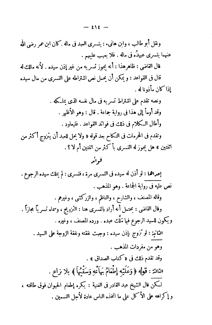وَنَقَلَ أَبُو طَالِبٍ، وَابْنُ هَانِئٍ: يَتَسَرَّى الْعَبْدُ فِي مَالِهِ. كَانَ ابْنُ عُمَرَ - رَضِيَ اللَّهُ عَنْهُمَا - يَتَسَرَّى عَبِيدُهُ فِي مَالِهِ. فَلَا يَعِيبُ عَلَيْهِمْ. قَالَ الْقَاضِي: ظَاهِرُ هَذَا: أَنَّهُ يَجُوزُ تَسَرِّيه مِنْ غَيْرِ إذْنِ سَيِّدِهِ. لِأَنَّهُ مَالِكٌ لَهُ قَالَ فِي الْقَوَاعِدِ: وَيُمْكِنُ أَنْ يُحْمَلُ نَصُّ اشْتِرَاطِهِ عَلَى التَّسَرِّي مِنْ مَالِ سَيِّدِهِ إذَا كَانَ مَأْذُونًا لَهُ. وَنَصُّهُ تَقَدَّمَ عَلَى اشْتِرَاطِ تَسَرِّيه فِي مَالِ نَفْسِهِ الَّذِي يَمْلِكُهُ. وَقَدْ أَوْمَأَ إلَى هَذَا فِي رِوَايَةِ جَمَاعَةٍ. قَالَ: وَهُوَ الْأَظْهَرُ وَأَطَالَ الْكَلَامَ فِي ذَلِكَ فِي فَوَائِدِ الْقَوَاعِدِ. فَلْيُعَاوَدْ وَتَقَدَّمَ فِي الْمُحَرَّمَاتِ فِي النِّكَاحِ بَعْدَ قَوْلِهِ " وَلَا يَحِلُّ لِلْعَبْدِ أَنْ يَتَزَوَّجَ أَكْثَرَ مِنْ اثْنَتَيْنِ " هَلْ يَجُوزُ لَهُ التَّسَرِّي بِأَكْثَرَ مِنْ اثْنَتَيْنِ أَمْ لَا؟ . فَوَائِدُ