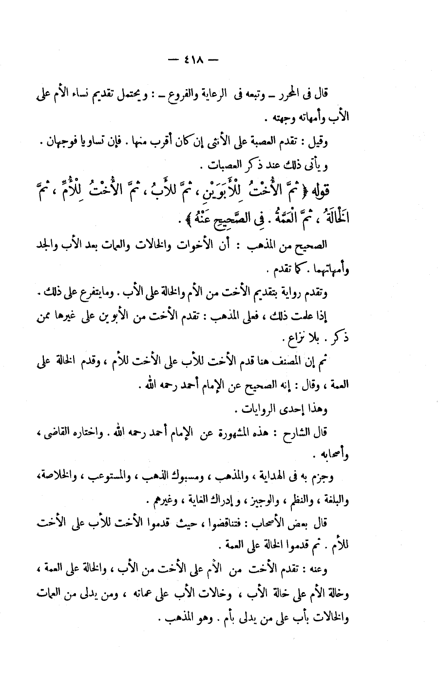 قَوْلُهُ (ثُمَّ الْأُخْتُ لِلْأَبَوَيْنِ، ثُمَّ لِلْأَبِ، ثُمَّ الْأُخْتُ لِلْأُمِّ، ثُمَّ الْخَالَةُ، ثُمَّ الْعَمَّةُ. فِي الصَّحِيحِ عَنْهُ) الصَّحِيحُ مِنْ الْمَذْهَبِ: أَنَّ الْأَخَوَاتِ وَالْخَالَاتِ وَالْعَمَّاتِ بَعْدَ الْأَبِ وَالْجَدِّ وَأُمَّهَاتِهِمَا. كَمَا تَقَدَّمَ وَتَقَدَّمَ رِوَايَةٌ بِتَقْدِيمِ الْأُخْتِ مِنْ الْأُمِّ وَالْخَالَةِ عَلَى الْأَبِ. وَمَا يَتَفَرَّعُ عَلَى ذَلِكَ. إذَا عَلِمْت ذَلِكَ، فَعَلَى الْمَذْهَبِ: تُقَدَّمُ الْأُخْتُ مِنْ الْأَبَوَيْنِ عَلَى غَيْرِهَا مِمَّنْ ذُكِرَ بِلَا نِزَاعٍ. ثُمَّ إنَّ الْمُصَنِّفَ هُنَا قَدَّمَ الْأُخْتَ لِلْأَبِ عَلَى الْأُخْتِ لِلْأُمِّ، وَقَدَّمَ الْخَالَةَ عَلَى الْعَمَّةِ، وَقَالَ. إنَّهُ الصَّحِيحُ عَنْ الْإِمَامِ أَحْمَدَ - رَحِمَهُ اللَّهُ - وَهَذَا إحْدَى الرِّوَايَاتِ قَالَ الشَّارِحُ: هَذِهِ الْمَشْهُورَةُ عَنْ الْإِمَامِ أَحْمَدَ وَاخْتَارَهُ الْقَاضِي، وَأَصْحَابُهُ. وَجَزَمَ بِهِ فِي الْهِدَايَةِ، وَالْمُذْهَبِ، وَمَسْبُوكِ الذَّهَبِ، وَالْمُسْتَوْعِبِ، وَالْخُلَاصَةِ، وَالْبُلْغَةِ، وَالنَّظْمِ، وَالْوَجِيزِ، وَإِدْرَاكِ الْغَايَةِ، وَغَيْرِهِمْ. قَالَ بَعْضُ الْأَصْحَابِ: فَتَنَاقَضُوا، حَيْثُ قَدَّمُوا الْأُخْتَ لِلْأَبِ عَلَى الْأُخْتِ لِلْأُمِّ. ثُمَّ قَدَّمُوا الْخَالَةَ عَلَى الْعَمَّةِ. وَعَنْهُ: تُقَدَّمُ الْأُخْتُ مِنْ الْأُمِّ عَلَى الْأُخْتِ مِنْ الْأَبِ، وَالْخَالَةُ عَلَى الْعَمَّةِ، وَخَالَةُ الْأُمِّ عَلَى خَالَةِ الْأَبِ، وَخَالَاتُ الْأَبِ عَلَى عَمَّاتِهِ، وَمَنْ يُدْلِي مِنْ الْعَمَّاتِ وَالْخَالَاتِ بِأَبٍ عَلَى مَنْ يُدْلِي بِأُمٍّ. وَهُوَ الْمَذْهَبُ