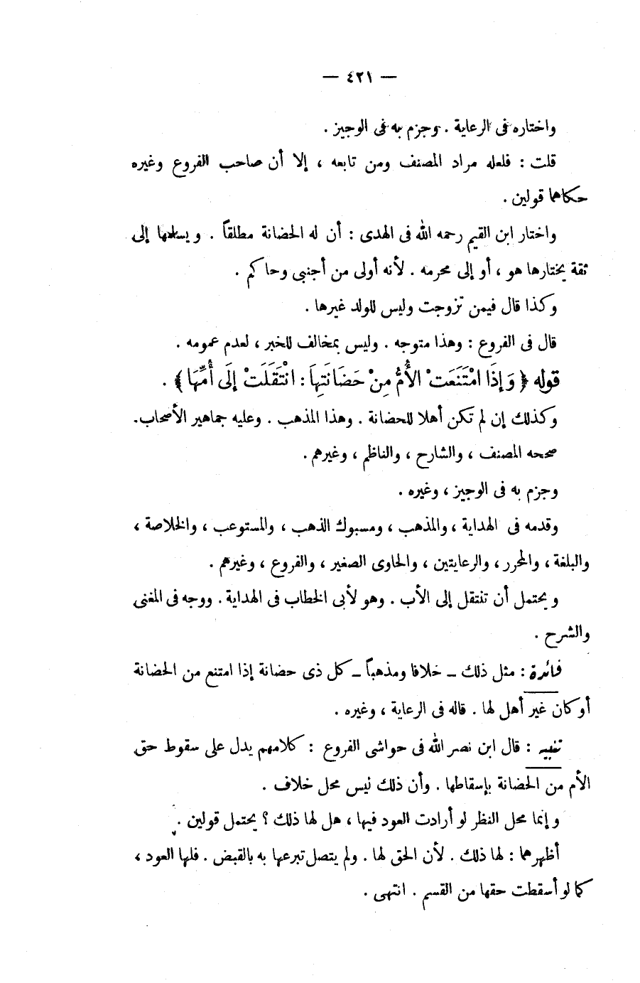 قَالَ ابْنُ نَصْرِ اللَّهِ فِي حَوَاشِي الْفُرُوعِ: كَلَامُهُمْ يَدُلُّ عَلَى سُقُوطِ حَقِّ الْأُمِّ مِنْ الْحَضَانَةِ بِإِسْقَاطِهَا. وَأَنَّ ذَلِكَ لَيْسَ مَحَلُّ خِلَافٍ. وَإِنَّمَا مَحَلُّ النَّظَرِ لَوْ أَرَادَتْ الْعَوْدَ فِيهَا، هَلْ لَهَا ذَلِكَ؟ يُحْتَمَلُ قَوْلَيْنِ. أَظْهَرُهُمَا: لَهَا ذَلِكَ. لِأَنَّ الْحَقَّ لَهَا. وَلَمْ يَتَّصِلْ تَبَرُّعُهَا بِهِ بِالْقَبْضِ. فَلَهَا الْعَوْدُ كَمَا لَوْ أَسْقَطَتْ حَقَّهَا مِنْ الْقَسْمِ. انْتَهَى