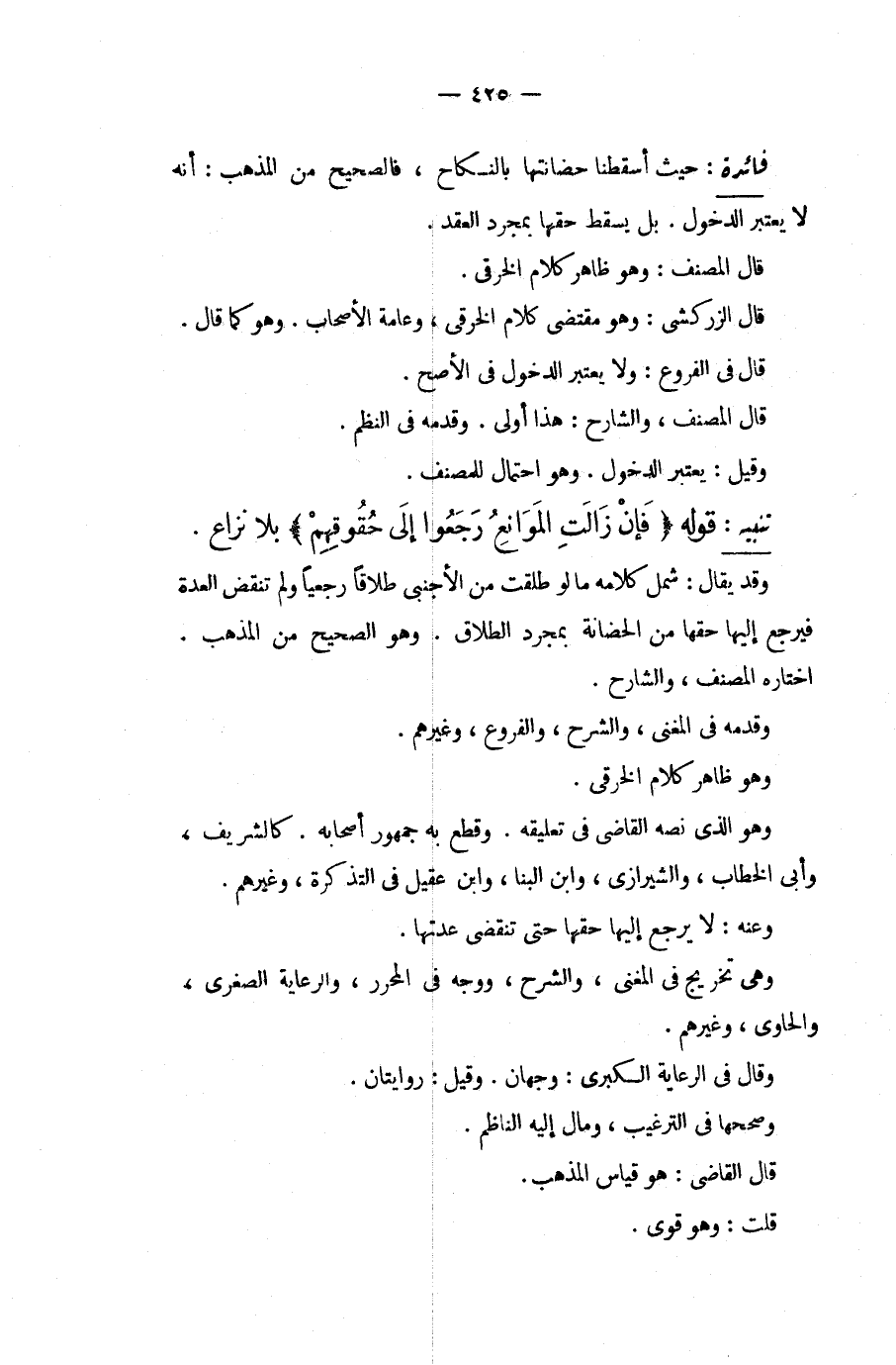 تَنْبِيهٌ: قَوْلُهُ (فَإِنْ زَالَتْ الْمَوَانِعُ رَجَعُوا إلَى حُقُوقِهِمْ) بِلَا نِزَاعٍ. وَقَدْ يُقَالُ: شَمِلَ كَلَامُهُ مَا لَوْ طَلُقَتْ مِنْ الْأَجْنَبِيِّ طَلَاقًا رَجْعِيًّا وَلَمْ تَنْقَضِ الْعِدَّةُ فَيَرْجِعُ إلَيْهَا حَقُّهَا مِنْ الْحَضَانَةِ بِمُجَرَّدِ الطَّلَاقِ. وَهُوَ الصَّحِيحُ مِنْ الْمَذْهَبِ. اخْتَارَهُ الْمُصَنِّفُ، وَالشَّارِحُ. وَقَدَّمَهُ فِي الْمُغْنِي، وَالشَّرْحِ، وَالْفُرُوعِ، وَغَيْرِهِمْ. وَهُوَ ظَاهِرُ كَلَامِ الْخِرَقِيِّ وَهُوَ الَّذِي نَصَّهُ الْقَاضِي فِي تَعْلِيقِهِ. وَقَطَعَ بِهِ جُمْهُورُ أَصْحَابِهِ. كَالشَّرِيفِ، وَأَبِي الْخَطَّاب، وَالشِّيرَازِيِّ، وَابْنِ الْبَنَّا، وَابْنِ عَقِيلٍ فِي التَّذْكِرَةِ، وَغَيْرِهِمْ. وَعَنْهُ: لَا يَرْجِعُ إلَيْهَا حَقُّهَا حَتَّى تَنْقَضِيَ عِدَّتُهَا. وَهِيَ تَخْرِيجٌ فِي الْمُغْنِي، وَالشَّرْحِ، وَوَجْهٌ فِي الْمُحَرَّرِ، وَالرِّعَايَةِ الصُّغْرَى وَالْحَاوِي، وَغَيْرِهِمْ. وَقَالَ فِي الرِّعَايَةِ الْكُبْرَى: وَجْهَانِ. وَقِيلَ: رِوَايَتَانِ. وَصَحَّحَهَا فِي التَّرْغِيبِ، وَمَالَ إلَيْهِ النَّاظِمُ. قَالَ الْقَاضِي: هُوَ قِيَاسُ الْمَذْهَبِ. قُلْت: وَهُوَ قَوِيٌّ.