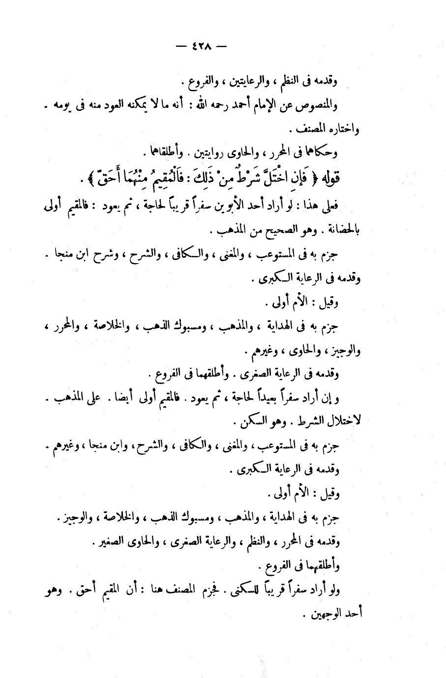 قَوْلُهُ (فَإِنْ اخْتَلَّ شَرْطٌ مِنْ ذَلِكَ: فَالْمُقِيمُ مِنْهُمَا أَحَقُّ) فَعَلَى هَذَا: لَوْ أَرَادَ أَحَدُ الْأَبَوَيْنِ سَفَرًا قَرِيبًا لِحَاجَةٍ، ثُمَّ يَعُودُ: فَالْمُقِيمُ أَوْلَى بِالْحَضَانَةِ. وَهُوَ الصَّحِيحُ مِنْ الْمَذْهَبِ. جَزَمَ بِهِ فِي الْمُسْتَوْعِبِ، وَالْمُغْنِي، وَالْكَافِي، وَالشَّرْحِ، وَشَرْحِ ابْنِ مُنَجَّا وَقَدَّمَهُ فِي الرِّعَايَةِ الْكُبْرَى. وَقِيلَ: الْأُمُّ أَوْلَى جَزَمَ بِهِ فِي الْهِدَايَةِ، وَالْمُذْهَبِ، وَمَسْبُوكِ الذَّهَبِ، وَالْخُلَاصَةِ، وَالْمُحَرَّرِ، وَالْوَجِيزِ، وَالْحَاوِي، وَغَيْرِهِمْ. وَقَدَّمَهُ فِي الرِّعَايَةِ الصُّغْرَى. وَأَطْلَقَهُمَا فِي الْفُرُوعِ. وَإِنْ أَرَادَ سَفَرًا بَعِيدًا لِحَاجَةٍ، ثُمَّ يَعُودُ. فَالْمُقِيمُ أَوْلَى أَيْضًا. عَلَى الْمَذْهَبِ. لِاخْتِلَالِ الشَّرْطِ. وَهُوَ السَّكَنُ. جَزَمَ بِهِ فِي الْمُسْتَوْعِبِ، وَالْمُغْنِي، وَالْكَافِي وَالشَّرْحِ، وَابْنِ مُنَجَّا، وَغَيْرِهِمْ. وَقَدَّمَهُ فِي الرِّعَايَةِ الْكُبْرَى. وَقِيلَ: الْأُمُّ أَوْلَى. جَزَمَ بِهِ فِي الْهِدَايَةِ، وَالْمُذْهَبِ، وَمَسْبُوكِ الذَّهَبِ، وَالْخُلَاصَةِ، وَالْوَجِيزِ. وَقَدَّمَهُ فِي الْمُحَرَّرِ، وَالنَّظْمِ، وَالرِّعَايَةِ الصُّغْرَى، وَالْحَاوِي الصَّغِيرِ. وَأَطْلَقَهُمَا فِي الْفُرُوعِ. وَلَوْ أَرَادَ سَفَرًا قَرِيبًا لِلسُّكْنَى. فَجَزَمَ الْمُصَنِّفُ هُنَا: أَنَّ الْمُقِيمَ أَحَقُّ: وَهُوَ أَحَدُ الْوَجْهَيْنِ.