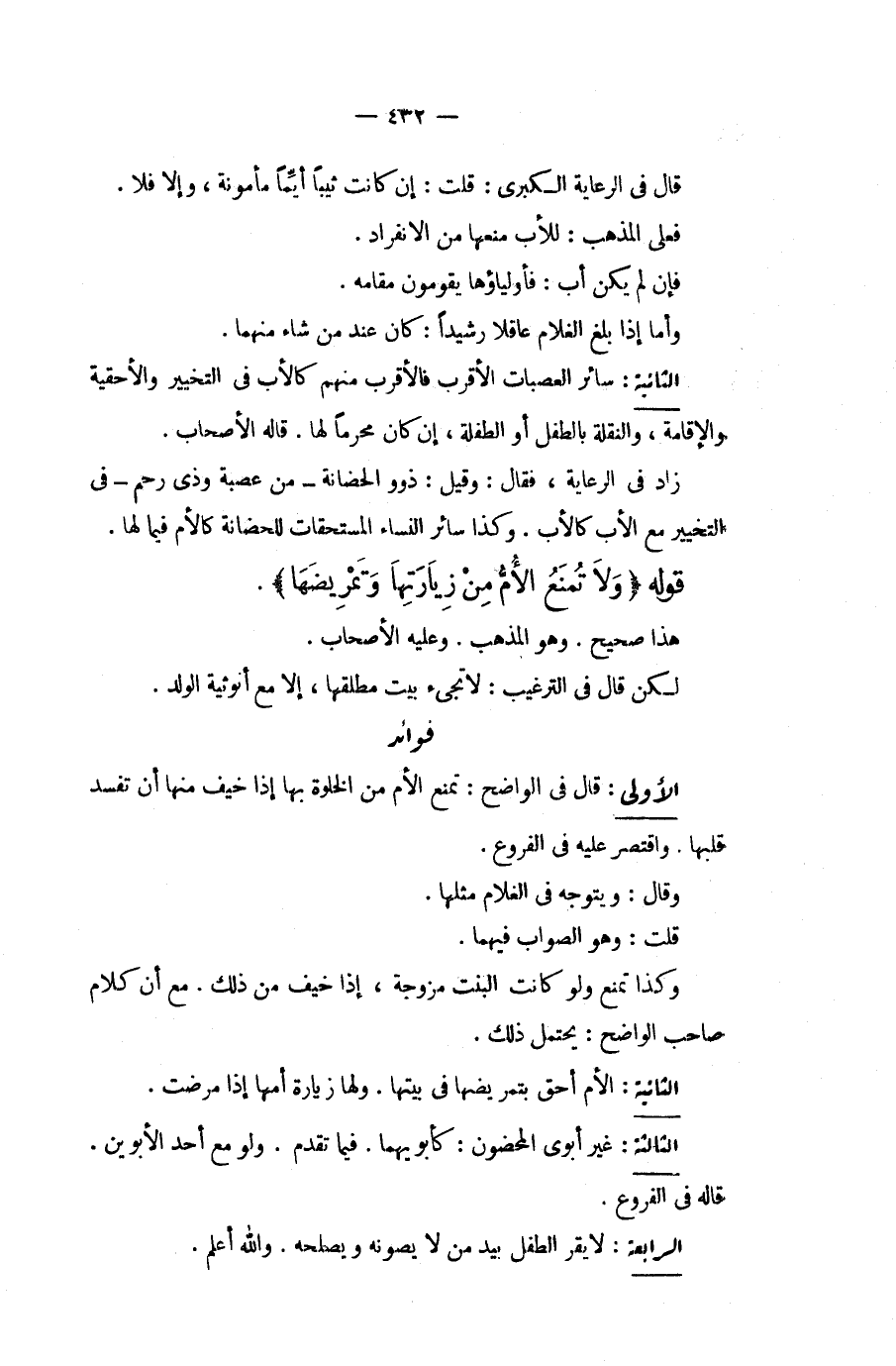 الْأُولَى: قَالَ فِي الْوَاضِحِ: تُمْنَعُ الْأُمُّ مِنْ الْخَلْوَةِ بِهَا إذَا خِيفَ مِنْهَا أَنْ تُفْسِدَ قَلْبَهَا وَاقْتَصَرَ عَلَيْهِ فِي الْفُرُوعِ. وَقَالَ: وَيُتَوَجَّهُ فِي الْغُلَامِ مِثْلُهَا. قُلْت: وَهُوَ الصَّوَابُ فِيهِمَا. وَكَذَا تُمْنَعُ وَلَوْ كَانَتْ الْبِنْتُ مُزَوَّجَةً، إذَا خِيفَ مِنْ ذَلِكَ. مَعَ أَنَّ كَلَامَ صَاحِبِ الْوَاضِحِ: يَحْتَمِلُ ذَلِكَ.