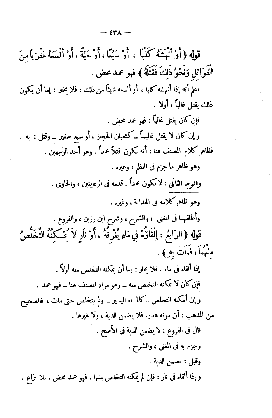قَوْلُهُ (أَوْ أَنْهَشَهُ كَلْبًا، أَوْ سَبُعًا، أَوْ حَيَّةً، أَوْ أَلْسَعَهُ عَقْرَبًا مِنْ الْقَوَاتِلِ وَنَحْوِ ذَلِكَ فَقَتَلَهُ) فَهُوَ عَمْدٌ مَحْضٌ. اعْلَمْ أَنَّهُ إذَا أَنْهَشَهُ كَلْبًا، أَوْ أَلْسَعَهُ شَيْئًا مِنْ ذَلِكَ، فَلَا يَخْلُو: إمَّا أَنْ يَكُونَ ذَلِكَ يَقْتُلُ غَالِبًا، أَوْ لَا. فَإِنْ كَانَ يَقْتُلُ غَالِبًا: فَهُوَ عَمْدٌ مَحْضٌ. وَإِنْ كَانَ لَا يَقْتُلُ غَالِبًا كَثُعْبَانِ الْحِجَازِ، أَوْ سَبُعٍ صَغِيرٍ وَقُتِلَ: بِهِ. فَظَاهِرُ كَلَامِ الْمُصَنِّفِ هُنَا: أَنَّهُ يَكُونُ قَتَلَا عَمْدًا. وَهُوَ أَحَدُ الْوَجْهَيْنِ. وَهُوَ ظَاهِرُ مَا جَزَمَ فِي النَّظْمِ، وَغَيْرِهِ.