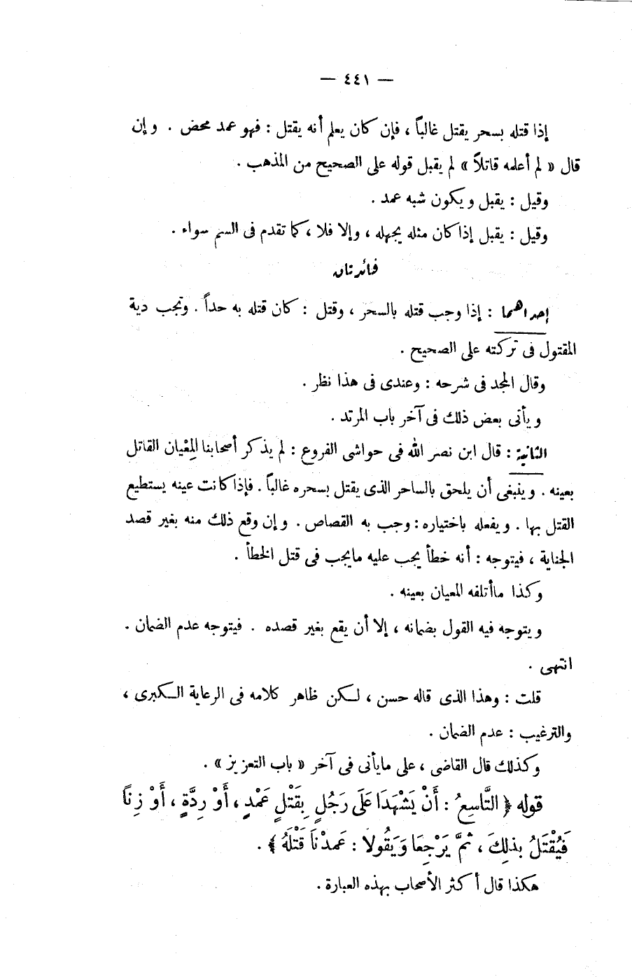 إحْدَاهُمَا: إذَا وَجَبَ قَتْلُهُ بِالسَّحَرِ، وَقُتِلَ: كَانَ قَتْلُهُ بِهِ حَدًّا. وَتَجِبُ دِيَةُ الْمَقْتُولِ فِي تَرِكَتِهِ عَلَى الصَّحِيحِ وَقَالَ الْمَجْدُ فِي شَرْحِهِ: وَعِنْدِي فِي هَذَا نَظَرٌ. وَيَأْتِي بَعْضُ ذَلِكَ فِي آخِرِ بَابِ الْمُرْتَدِّ.