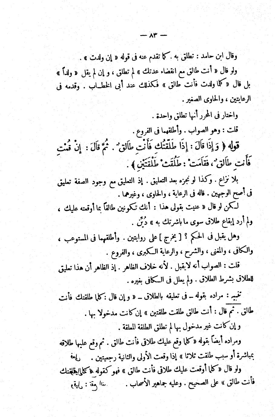 وَقَالَ ابْنُ حَامِدٍ: تَطْلُقُ بِهِ، كَمَا تَقَدَّمَ عَنْهُ فِي قَوْلِهِ " إنْ وَلَدْت "، وَلَوْ قَالَ " أَنْتِ طَالِقٌ مَعَ انْقِضَاءِ عِدَّتِك " لَمْ تَطْلُقْ، وَإِنْ لَمْ يَقُلْ " وَلَدًا " بَلْ قَالَ " كُلَّمَا وَلَدْت فَأَنْتِ طَالِقٌ " فَكَذَلِكَ عِنْدَ أَبِي الْخَطَّابِ، وَقَدَّمَهُ فِي الرِّعَايَتَيْنِ، وَالْحَاوِي الصَّغِيرِ، وَاخْتَارَ فِي الْمُحَرَّرِ أَنَّهَا تَطْلُقُ وَاحِدَةً، قُلْتُ: وَهُوَ الصَّوَابُ، وَأَطْلَقَهُمَا فِي الْفُرُوعِ.