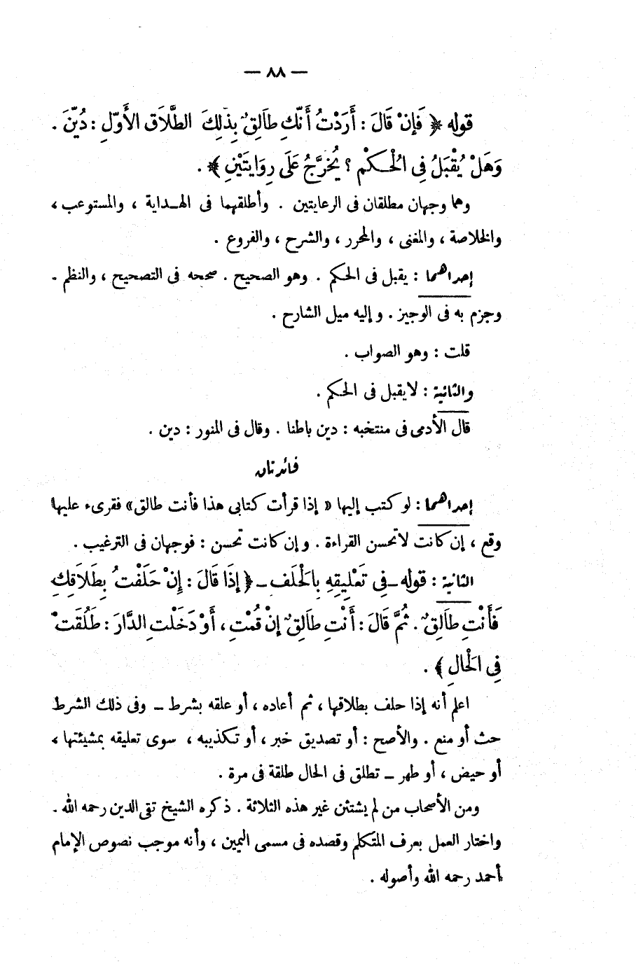 قَوْلُهُ (فَإِنْ قَالَ: أَرَدْت أَنَّكِ طَالِقٌ بِذَلِكَ الطَّلَاقِ الْأَوَّلِ: دُيِّنَ، وَهَلْ يُقْبَلُ فِي الْحُكْمِ؟ يُخَرَّجُ عَلَى رِوَايَتَيْنِ) ، وَهُمَا وَجْهَانِ مُطْلَقَانِ فِي الرِّعَايَتَيْنِ، وَأَطْلَقَهُمَا فِي الْهِدَايَةِ، وَالْمُسْتَوْعِبِ، وَالْخُلَاصَةِ، وَالْمُغْنِي، وَالْمُحَرَّرِ، وَالشَّرْحِ، وَالْفُرُوعِ. إحْدَاهُمَا: يُقْبَلُ فِي الْحُكْمِ، وَهُوَ الصَّحِيحُ، صَحَّحَهُ فِي التَّصْحِيحِ، وَالنَّظْمِ، وَجَزَمَ بِهِ فِي الْوَجِيزِ، وَإِلَيْهِ مَيْلُ الشَّارِحِ، قُلْتُ: وَهُوَ الصَّوَابُ. وَالثَّانِيَةُ: لَا يُقْبَلُ فِي الْحُكْمِ، قَالَ الْأَدَمِيُّ فِي مُنْتَخَبِهِ: دُيِّنَ بَاطِنًا، وَقَالَ فِي الْمُنَوِّرِ: دُيِّنَ.