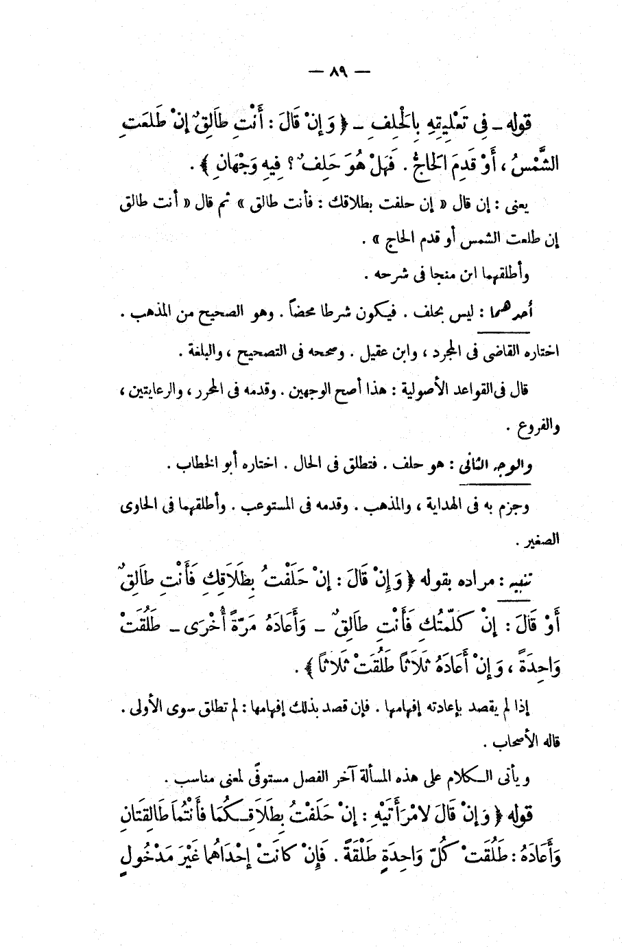 قَوْلُهُ فِي تَعْلِيقِهِ بِالْحَلْفِ (وَإِنْ قَالَ: أَنْتِ طَالِقٌ إنْ طَلَعَتْ الشَّمْسُ، أَوْ قَدِمَ الْحَاجُّ، فَهَلْ هُوَ حَلِفٌ؟ فِيهِ وَجْهَانِ) ، يَعْنِي: إنْ قَالَ " إنْ حَلَفْت بِطَلَاقِك: فَأَنْتِ طَالِقٌ " ثُمَّ قَالَ " أَنْتِ طَالِقٌ إنْ طَلَعَتْ الشَّمْسُ أَوْ قَدِمَ الْحَاجُّ "، وَأَطْلَقَهُمَا ابْنُ مُنَجَّا فِي شَرْحِهِ، أَحَدُهُمَا: لَيْسَ بِحَلِفٍ، فَيَكُونُ شَرْطًا مَحْضًا، وَهُوَ الصَّحِيحُ مِنْ الْمَذْهَبِ، اخْتَارَهُ الْقَاضِي فِي الْمُجَرَّدِ، وَابْنُ عَقِيلٍ، وَصَحَّحَهُ فِي التَّصْحِيحِ، وَالْبُلْغَةِ، قَالَ فِي الْقَوَاعِدِ الْأُصُولِيَّةِ: هَذَا أَصَحُّ الْوَجْهَيْنِ، وَقَدَّمَهُ فِي الْمُحَرَّرِ، وَالرِّعَايَتَيْنِ، وَالْفُرُوعِ، وَالْوَجْهُ الثَّانِي: هُوَ حَلِفٌ، فَتَطْلُقُ فِي الْحَالِ، اخْتَارَهُ أَبُو الْخَطَّابِ، وَجَزَمَ بِهِ فِي الْهِدَايَةِ، وَالْمُذْهَبِ، وَقَدَّمَهُ فِي الْمُسْتَوْعِبِ، وَأَطْلَقَهُمَا فِي الْحَاوِي الصَّغِيرِ.