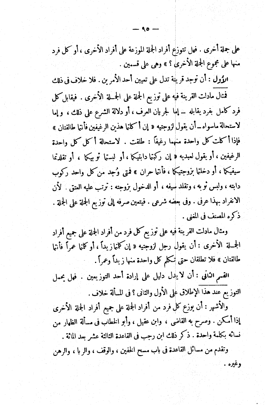 عَلَى جُمْلَةٍ أُخْرَى، فَهَلْ تَتَوَزَّعُ أَفْرَادُ الْجُمْلَةِ الْمُوَزَّعَةِ عَلَى أَفْرَادِ الْأُخْرَى، أَوْ كُلُّ فَرْدٍ مِنْهَا عَلَى مَجْمُوعِ الْجُمْلَةِ الْأُخْرَى؟ " وَهِيَ عَلَى قِسْمَيْنِ، الْأَوَّلُ: أَنْ تُوجَدَ قَرِينَةٌ تَدُلُّ عَلَى تَعْيِينِ أَحَدِ الْأَمْرَيْنِ، فَلَا خِلَافَ فِي ذَلِكَ. فَمِثَالُ مَا دَلَّتْ الْقَرِينَةُ فِيهِ عَلَى تَوْزِيعِ الْجُمْلَةِ عَلَى الْجُمْلَةِ الْأُخْرَى، فَيُقَابَلُ كُلُّ فَرْدٍ كَامِلٍ بِفَرْدِ يُقَابِلُهُ إمَّا لِجَرَيَانِ الْعُرْفِ، أَوْ دَلَالَةِ الشَّرْعِ عَلَى ذَلِكَ، وَإِمَّا لِاسْتِحَالَةِ مَا سِوَاهُ أَنْ يَقُولَ لِزَوْجَتَيْهِ " إنْ أَكَلْتُمَا هَذَيْنِ الرَّغِيفَيْنِ فَأَنْتُمَا طَالِقَتَانِ " فَإِذَا أَكَلَتْ كُلُّ وَاحِدَةٍ مِنْهُمَا رَغِيفًا: طَلُقَتْ، لِاسْتِحَالَةِ أَكْلِ كُلِّ وَاحِدَةٍ الرَّغِيفَيْنِ، أَوْ يَقُولُ لِعَبْدَيْهِ " إنْ رَكِبْتُمَا دَابَّتَيْكُمَا، أَوْ لَبِسْتُمَا ثَوْبَيْكُمَا، أَوْ تَقَلَّدْتُمَا سَيْفَيْكُمَا، أَوْ دَخَلْتُمَا بِزَوْجَتَيْكُمَا، فَأَنْتُمَا حُرَّانِ " فَمَتَى وُجِدَ مِنْ كُلِّ وَاحِدٍ رُكُوبُ دَابَّتِهِ، وَلُبْسُ ثَوْبِهِ، وَتَقَلُّدُ سَيْفِهِ، أَوْ الدُّخُولُ بِزَوْجَتِهِ: تَرَتَّبَ عَلَيْهِ الْعِتْقُ؛ لِأَنَّ الِانْفِرَادَ بِهَذَا عُرْفِيٌّ، وَفِي بَعْضِهِ شَرْعِيٌّ، فَيَتَعَيَّنُ صَرْفُهُ إلَى تَوْزِيعِ الْجُمْلَةِ عَلَى الْجُمْلَةِ، ذَكَرَهُ الْمُصَنِّفُ فِي الْمُغْنِي، وَمِثَالُ مَا دَلَّتْ الْقَرِينَةُ فِيهِ عَلَى تَوْزِيعِ كُلِّ فَرْدٍ مِنْ أَفْرَادِ الْجُمْلَةِ عَلَى جَمِيعِ أَفْرَادِ الْجُمْلَةِ الْأُخْرَى: أَنْ يَقُولَ رَجُلٌ لِزَوْجَتَيْهِ " إنْ كَلَّمْتُمَا زَيْدًا، أَوْ كَلَّمْتُمَا عَمْرًا فَأَنْتُمَا طَالِقَتَانِ " فَلَا تَطْلُقَانِ حَتَّى تُكَلِّمَ كُلُّ وَاحِدَةٍ مِنْهَا زَيْدًا وَعَمْرًا.