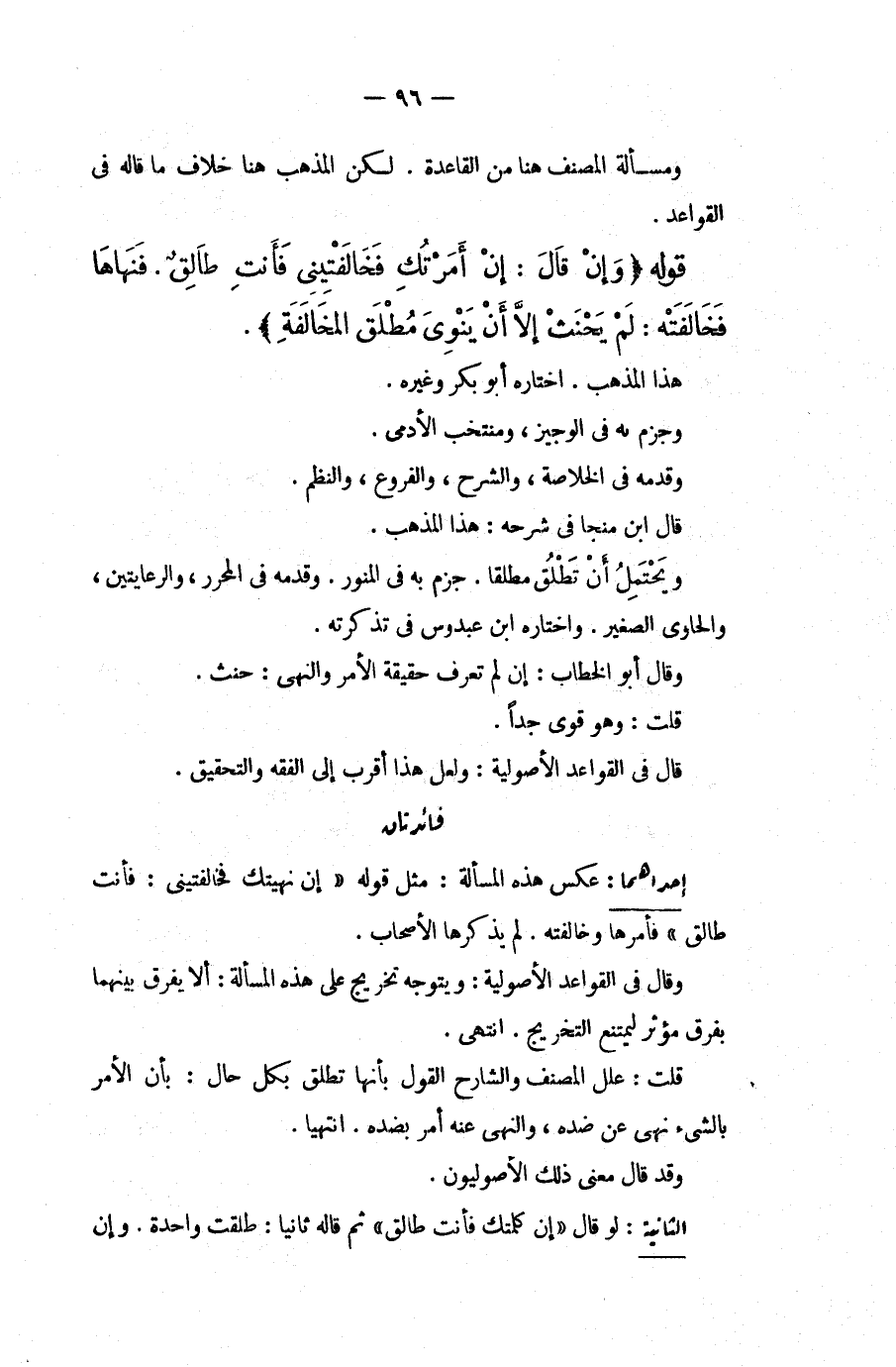 قَوْلُهُ (وَإِنْ قَالَ: إنْ أَمَرْتُك فَخَالَفْتِينِي فَأَنْتِ طَالِقٌ، فَنَهَاهَا فَخَالَفَتْهُ: لَمْ يَحْنَثْ إلَّا أَنْ يَنْوِيَ مُطْلَقَ الْمُخَالَفَةِ) ، هَذَا الْمَذْهَبُ، اخْتَارَهُ أَبُو بَكْرٍ وَغَيْرُهُ، وَجَزَمَ فِي الْوَجِيزِ، وَمُنْتَخَبِ الْأَدَمِيِّ، وَقَدَّمَهُ فِي الْخُلَاصَةِ، وَالشَّرْحِ، وَالْفُرُوعِ، وَالنَّظْمِ، قَالَ ابْنُ مُنَجَّا فِي شَرْحِهِ: هَذَا الْمَذْهَبُ، وَيَحْتَمِلُ أَنْ تَطْلُقَ مُطْلَقًا، جَزَمَ بِهِ فِي الْمُنَوِّرِ، وَقَدَّمَهُ فِي الْمُحَرَّرِ، وَالرِّعَايَتَيْنِ، وَالْحَاوِي الصَّغِيرِ، وَاخْتَارَهُ ابْنُ عَبْدُوسٍ فِي تَذْكِرَتِهِ، وَقَالَ أَبُو الْخَطَّابِ: إنْ لَمْ تَعْرِفْ حَقِيقَهُ الْأَمْرِ وَالنَّهْي: حَنِثَ، قُلْت: وَهُوَ قَوِيٌّ جِدًّا، قَالَ فِي الْقَوَاعِدِ الْأُصُولِيَّةِ: وَلَعَلَّ هَذَا أَقْرَبُ إلَى الْفِقْهِ وَالتَّحْقِيقِ.