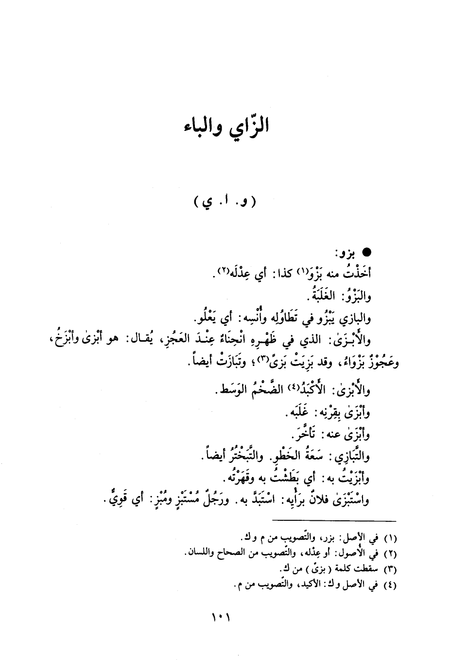 بزو أخَذْت منه بَزْوَكذا : أي عِدْلَه . والبَزْوُ : الغلَبَةُ . والبازي يَبْزُو في تَطَاوُيه وأنْسِه : أي يَعْلُو . والأبْزَى : الذي في ظَهْرِهِ انْحِنَاءٌ عِنْدَ العَجُزِ ، يُقال : هو أبْزى وأبْزَخُ ، وعَجُوْز بَزْوَاءُ ، وقد بَزِيَتْ بَزى ؛ وتَبَازَتْ أيضاً . والأبْزى : الأكْبَدُ الضخْمُ الوَسَط . وأبْزَى بِقِرْنِه : غَلَبَه . وأبْزَى عنه : تَأخرَ . والتبَازِي : لسَعَةُ الخَطْوِ . والتبَخْتُرُ أيضاً . وأبْزَيْتُ به : أي بَطَشْتُ به وقَهَرْتُه . واسْتَبْزَى فلانٌ برأيِه : اسْتَبَد به . ورَجُلٌ مُسْتَبْزٍ ومُبْزٍ : أي قَوِي .