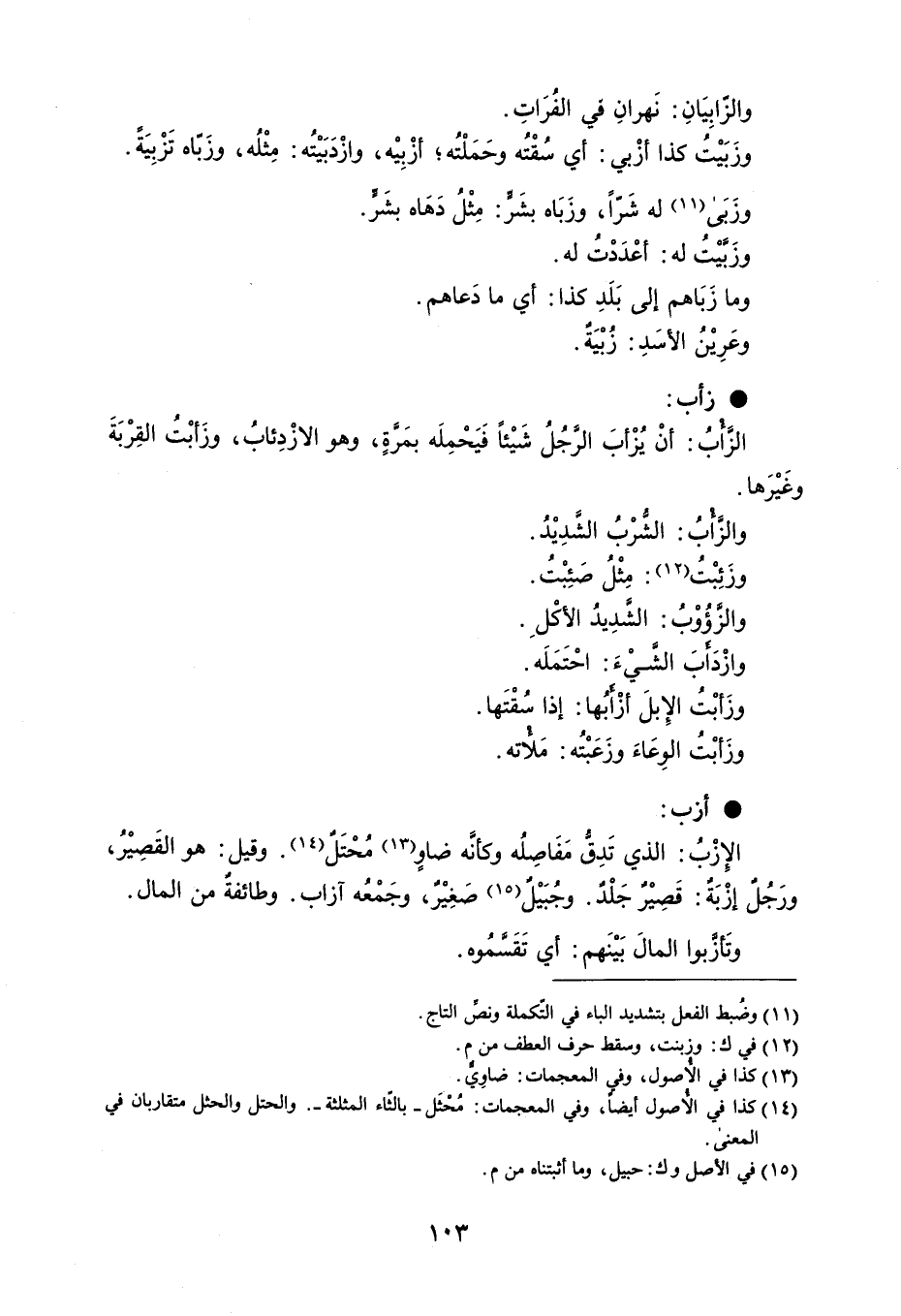 والزابِيَانِ : نَهرانِ قي الفُرَاتِ . وزَبَيْتُ كذا أزْبي : أي سُقْتُه وحَمَلْتُه ؛ أزْبِيْه ، وازْدَبَيْتُه : مِثْلُه ، وزَباه تَزْبِيَةً . وزَبَن له شَرّاً ، وزَبَاه بشَرّ : مِثْلُ دَهَاه بشَر . وزَبيْتُ له : أعْدَدْتُ له . وما زَبَاهم إلى بَلَدِ كذا : أي ما دَعاهم . وعَرِيْنُ الأسَدِ : زُبْيَةٌ . زأب الزأبُ : أنْ يُزْأبَ الرَّجُلُ شَيْئاً فَيَحْمِلَه بمَرَّةٍ ، وهو الازْدِئابُ ، وزَأبْتُ القِرْبَةَ وغَيْرَها . والزأبُ : الشرْبُ الشَّدِيْدُ . وزَئِبْتُ : مِثْلُ صَئِبْتُ . والزَّؤُوْبُ : الشَّدِيدُ الأكْلَ . وازْدَأبَ الشيْءَ : احْتَمَلَه . وزَأبْتُ الإبلَ أزْأبُها : إذا سُقْتَها . وزَأبْتُ الوِعَاءَ وزَعَبْتُه : مَلأته . أزب الإِزْبُ : الذي تَدِق مَفَاصِلُه وكأنه ضاو مُحْتَلٌ . وقيل : هو القَصِيْرُ ، ورَجُلٌ إزْبَةٌ : قَصِيْرٌ جَلْدٌ . وجُبَيْل صَغِيْرٌ ، وجَمْعُه آزاب . وطائفة من المال . وتَأزَبوا المالَ بَيْنَهم : أي تَقَسمُوه .
