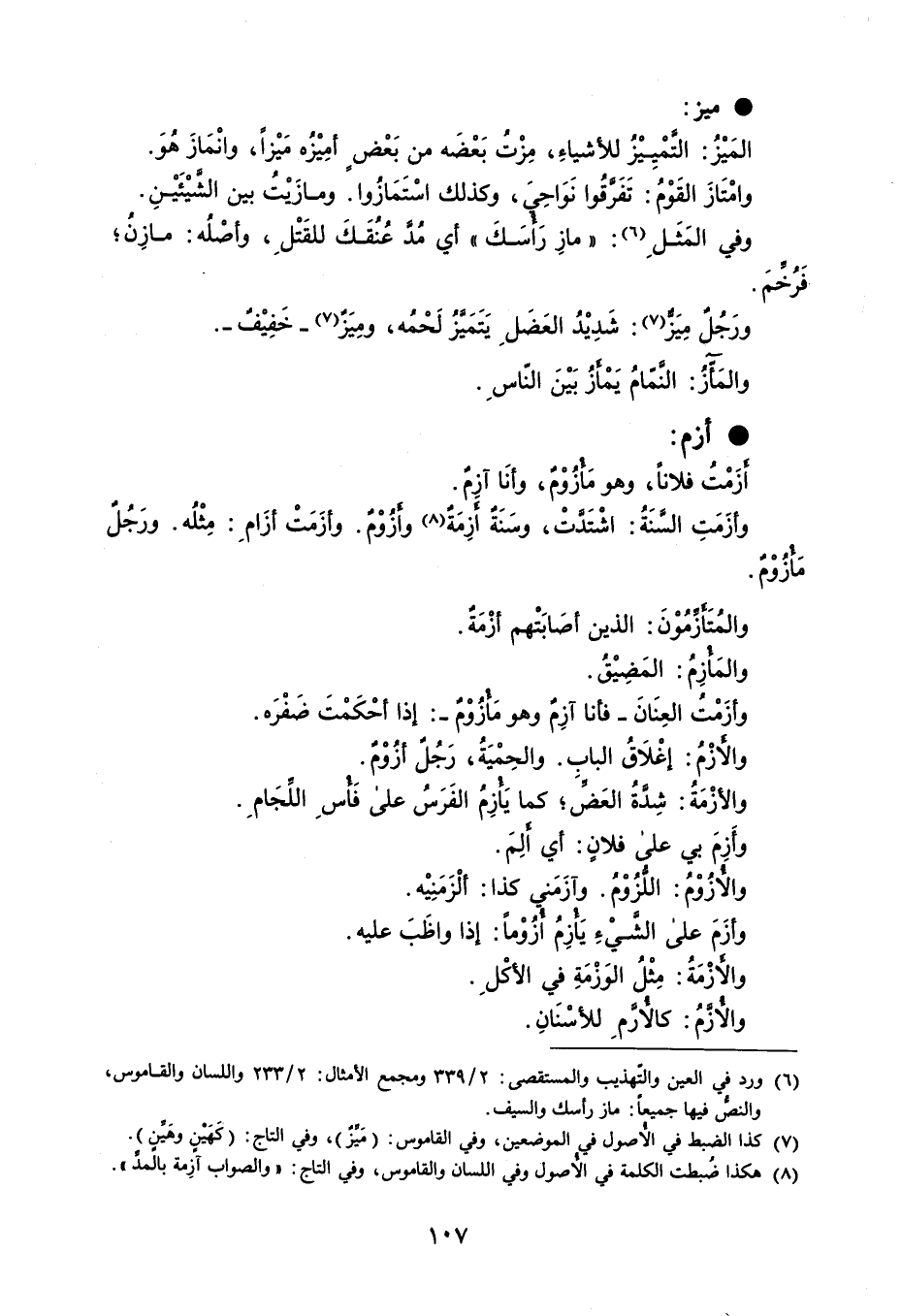 ميز المَيْزُ : التمْيِيْزُ للأشياءِ ، مِزْتُ بَعْضَه من بَعْضٍ أمِيْزُه مَيْزاً ، وانْمَازَ هُوَ . وامْتَازَ القَوْمُ : تَفَرقُوا نَوَاحِيَ ، وكذلك اسْتَمَازُوا . ومازَيْتُ بين الشَّيْئَيْنِ . وفي المَثَلِ : ' مازِ رَأسَكَ ' أي مُد عُنُقَكَ للقَتْلِ ، وأصْلُه : مازِنُ ؛ فَرُخمَ . ورَجل مِيَز : شَدِيْدُ العَضَلِ يَتَمَئز ُلَحْمُه ، ومِيَز - خَفِيْفٌ - . والمَآزُ : النمامُ يَمْأزُ بَيْنَ الناسِ . أزم أزَمْتُ فلاناً ، وهبر مَأزُوْمٌ ، وأنَا آزِمٌ . وأزَمَتِ السنَةُ : اشتَدتْ ، وسَنَة أزِمَة وأزُوْم . وأزَمَتْ أزَامِ : مِثْلُه . ورَجُل مَأزُوْم . والمُتَأزمُونَ : الذين أصَابَتْهم أزْمَة . والمَأزِمُ : المَضِيْقُ . وأزَمْتُ العِنَانَ - فأنا آزِم وهو مَأزُوْم : اذا أحْكَمْتَ ضَفْرَه . والأزم : إغْلاقُ البابِ . والحِمْيَةُ ، رَجُلٌ أزُوْمٌ . والأزْمَة : شِدةُ العَض ؛ كما يَأزِمُ الفَرَسُ على فَأسِ اللجَامِ . وأَزِمَ بي على فلانٍ : أي ألِمَ . والأزُوْمُ : اللزُوْمُ . وآزَمَني كذا : ألْزَمَنِيْه . وأزَمَ على الشيْءِ يَأزِمُ أزُوْماً : إذا واظَبَ عليه . والأزْمَةُ : مِثْلُ الوَزْمَةِ في الأكْلَ . والأزمُ : كالأرَّمَ للأسْنَانِ .