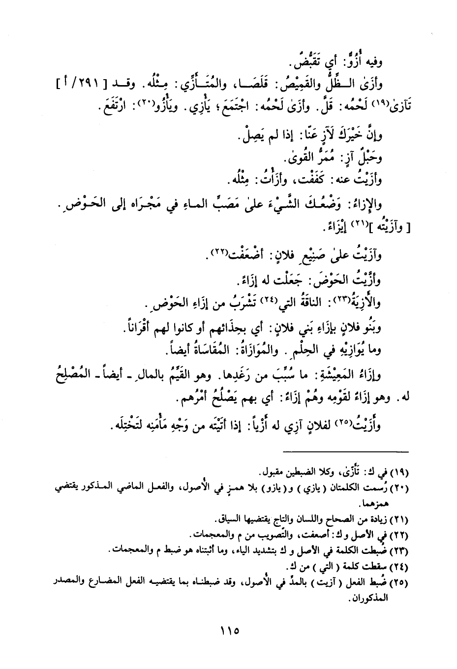 وفيه أزُو : أي تَقَبض . وأزَى الظل والقَمِيْصُ : قَلَصَا ، والمُتَأزِّي : مِثْلُه . وقد تَآزى لَحْمه : قَلَّ . وأزَى لَحْمُه : اجْتَمَعَ ؛ يَأزِي . ويَأزُو : ارْتَفَعَ . وإنَ خَيْرَكَ لآزٍعَنا : إذا لم يَصِلْ . وحَبْلٌ آزٍ : مُمَرُّ القُوى . وأزَيْت عنه : كَفَفْت ، وأزَأتُ : مِثْلُه . والإزاءُ : وَضعكَ الشيْءَ على مَصَبَ الماءِ في مَجْرَاه إلى الحَوْضِ . وآزَيْتُه إيْزَاءً . وآزَيْتُ على صَنِيْعِ فلانٍ : أضْعَفْت . وأزيْتُ الحَوْضَ : جَعَلْت له إزَاءً . والأزِيَةُ : الناقَةُ التي تَشْرَبُ من إزَاءِ الحَوْضِ . وبَنُو فلانٍ بإزَاءِ بَني فلانٍ : أي بحِذَائهم أو كانوا لهم أقْرَاناً . وما يُوَازِيْهِ في الحِلْمِ . والمُوَازَاةُ : المُقَاسَاةُ أيضاً . وإزَاءُ المَعِيْشَةِ : ما سُببَ من رَغَدِها . وهو القَيمُ بالمالِ - أيضاً - المُصْلِحُ له . وهو إزَاءٌ لقَوْمِه وهُمْ إزَاءٌ : أي بهم يَصْلُحُ أمْرُهم . وأزَيْتُ لفلانٍ آزِي له أزْياً : إذا أتَيْتَه من وَجْهِ مَأمَنِه لتَخْتِلَه .