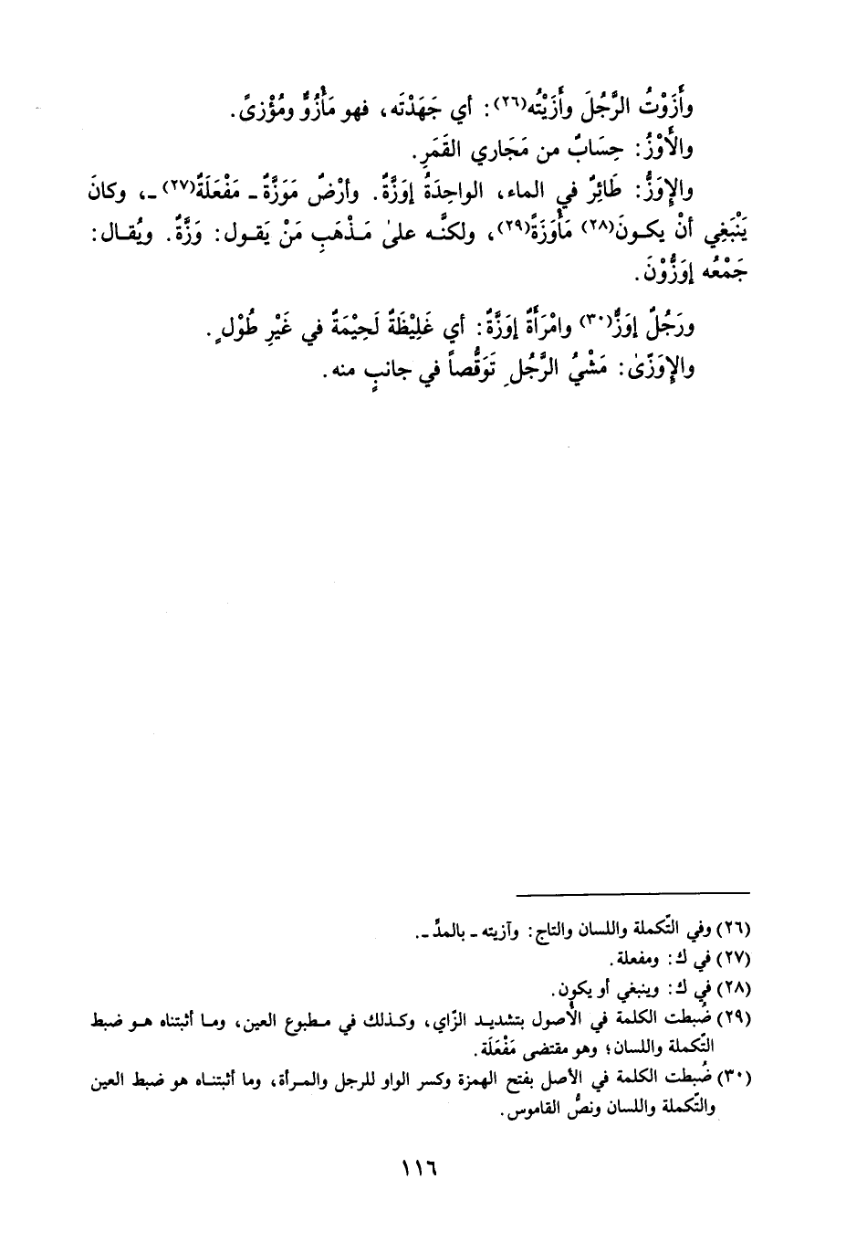 وأزَوْتُ الرجُلَ وأزَيْتُه : أي جَهَدْتَه ، فهو مَأزُو ومُؤْزىً . والأوْزُ : حِسَابٌ من مَجَاري القَمَرِ . والإوَزُ : طَائِرٌ في الماء ، الواحِدَةُ إوَزَّةٌ . وأرْضٌ مَوَزَّةٌ - مَفْعَلَةٌ - ، وكانَ يَنْبَغي أنْ يكونَ مَأوَزَةً ، ولكنه على مَذْهَبِ مَنْ يَقول : وَزةٌ . وُيقال : جَمْعُه إوَزوْنَ . ورَجُلٌ إوَز وامْرأةٌ إوَزَّةٌ : أي غَلِيْظَة لَحِيْمَةٌ في غَيْرِ طُوْلٍ . والإوَزّى : مَشْيُ الرَّجُلِ تَوَقصاً في جانبٍ منه .