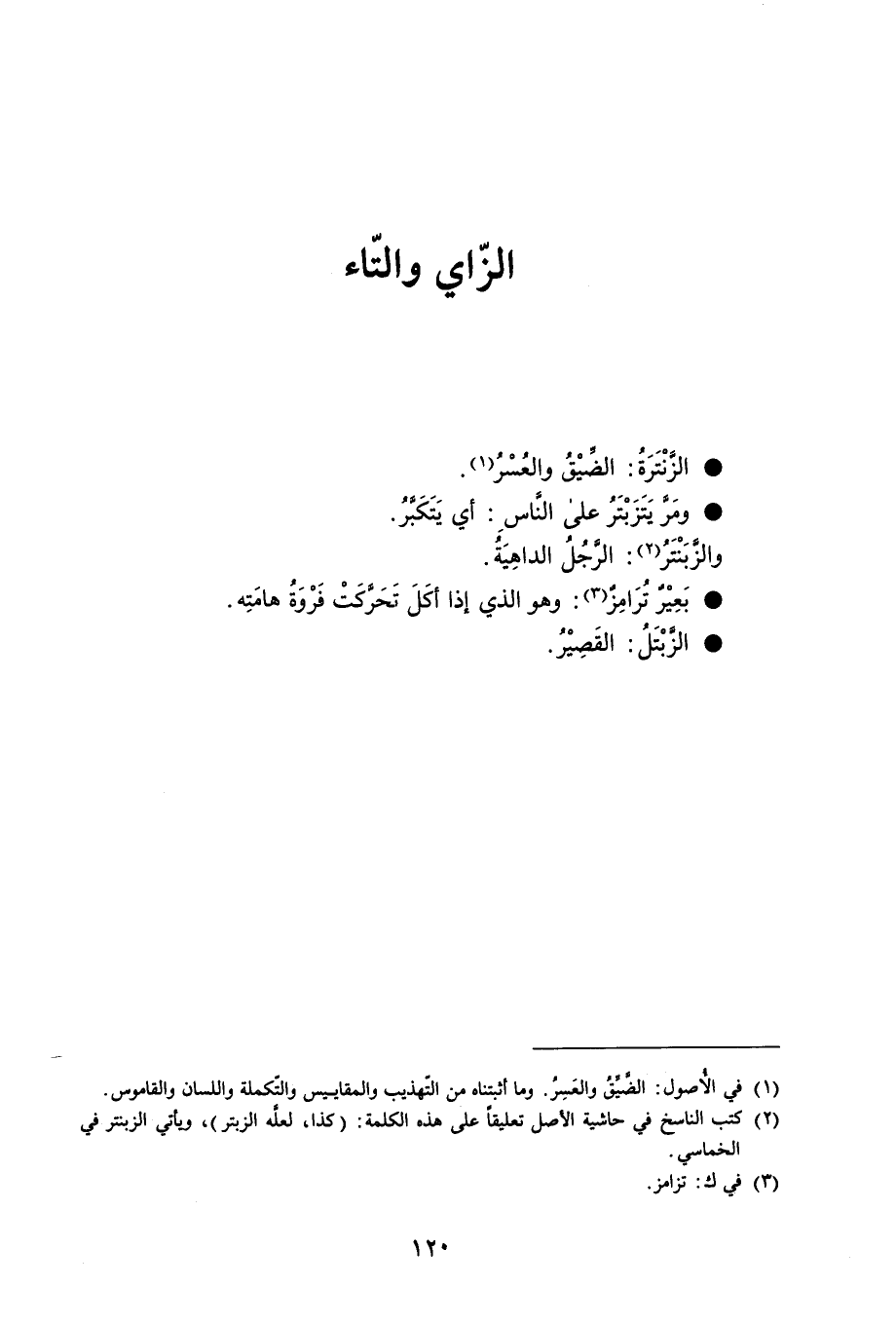 الزنْتَرَةُ الضَيْقُ والعُسْرُ . ومَرّ َيَتَزَبْتَرُعلى النَاسِ أي يَتَكَبرُ . والزَّبَنْتَرُ : الرجُلُ الداهِيَةُ . بَعِيْر تُرَامِزٌ وهو الذي إذا أكَلَ تَحَرَّكَتْ فَرْوَةُ هامَتِه . الزَبْتَلُ القَصِيْرُ .