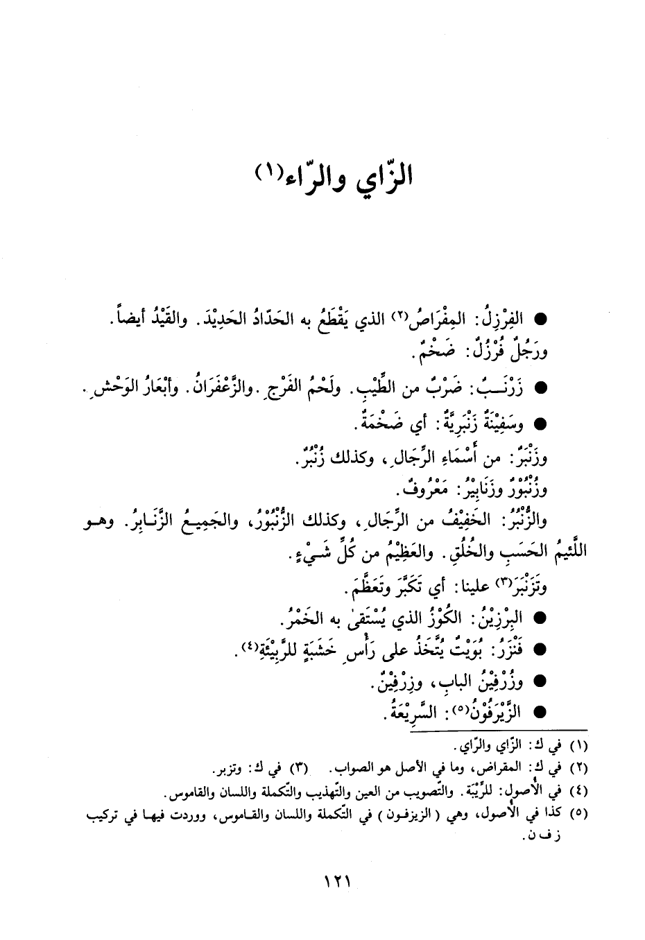 الفِرْزِلُ المِفْرَاصُ الذي يَقْطَعُ به الحَدّادُ الحَدِيْدَ . والقَيْدُ أيضاً . ورَجُلٌ فُرْزُلٌ : ضَخْمٌ . زَرْنَبٌ ضَرْبٌ من الطيْبِ . ولَحْمُ الفَرْجِ . والزَّعْفَرَانُ . وأبْعَارُ الوَحْشِ . وسَفِيْنَةٌ زَنْبَرِيَّةٌ أي ضَخْمَةٌ . وزَنْبَر : من أسْمَاءِ الرجَالِ ، وكذلك زُنْبُرٌ . وزُنْبُوْرٌ وزَنَابِيْرُ : مَعْرُوفٌ . والزنْبُرُ : الخَفِيْفُ من الرِّجَالِ ، وكذلك الزُّنْبُوْرُ ، والجَمِيعُ الزَّنَابِرُ . وهو اللَّئيمُ الحَسَبِ والخُلُقِ . والعَظِيْمُ من كُلِّ شَيْءٍ . وتزنبر علينا : أي تكبر و تَعَظَّمَ . البِرْزِيْنُ الكُوْزُ الذي يُسْتَقى به الخَمْرُ . فَنْزَرُ بُويت يُتَّخَذُ على رَأسِ خَشَبَةٍ للرَّبِيْئَةِ . وزُرْفِيْنُ البابِ ، وزِرْفِيْن . الزَّيْرَفُوْنُ السَّرِيْعَةُ .