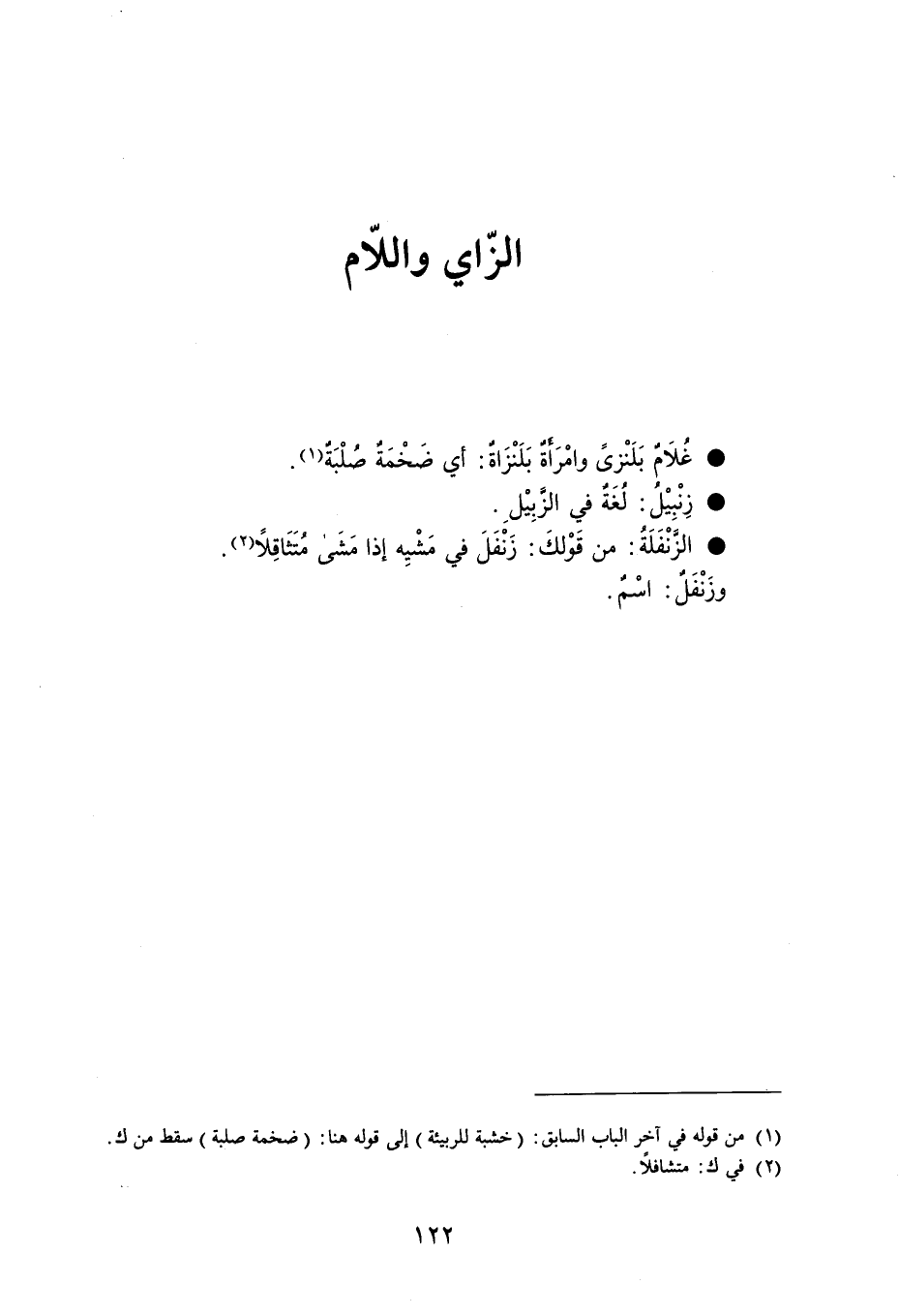 غُلَامٌ بَلَنْزى وامْرأةٌ بَلَنْزَاةٌ أي ضَخْمَةٌ صُلْبَةٌ . زِنْبِيْلُ لُغَةٌ في الزَّبِيْلِ . الزَّنْفَلَةُ من قَوْلكَ زَنْفَلَ في مَشْيِه إذا مَشَى مُتَثَاقِلاً وزَنْفَل اسْمٌ .