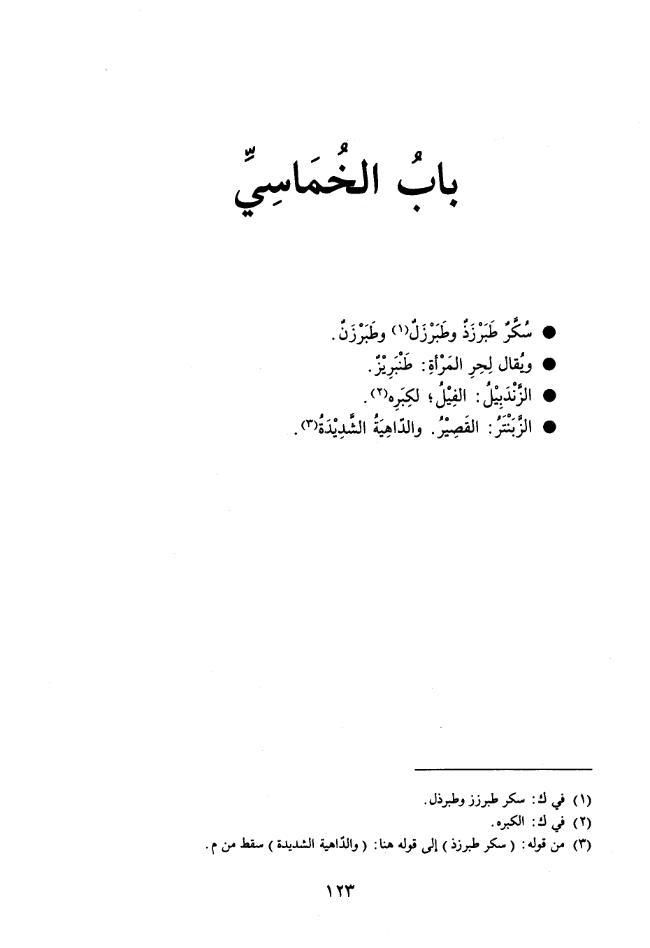 سُكرٌ طَبَرْزَذٌ وطَبَرْزَلٌ وطَبَرْزَنٌ . وُيقال لِحِرِ المَرْأةِ طَنْبَرِيْزٌ . الزَّنْدَبِيْلُ الفِيْلُ ؛ لكِبَرِه . الزَّبَنْتَرُ القَصِيْرُ . والداهِيَةُ الشًدِيدة