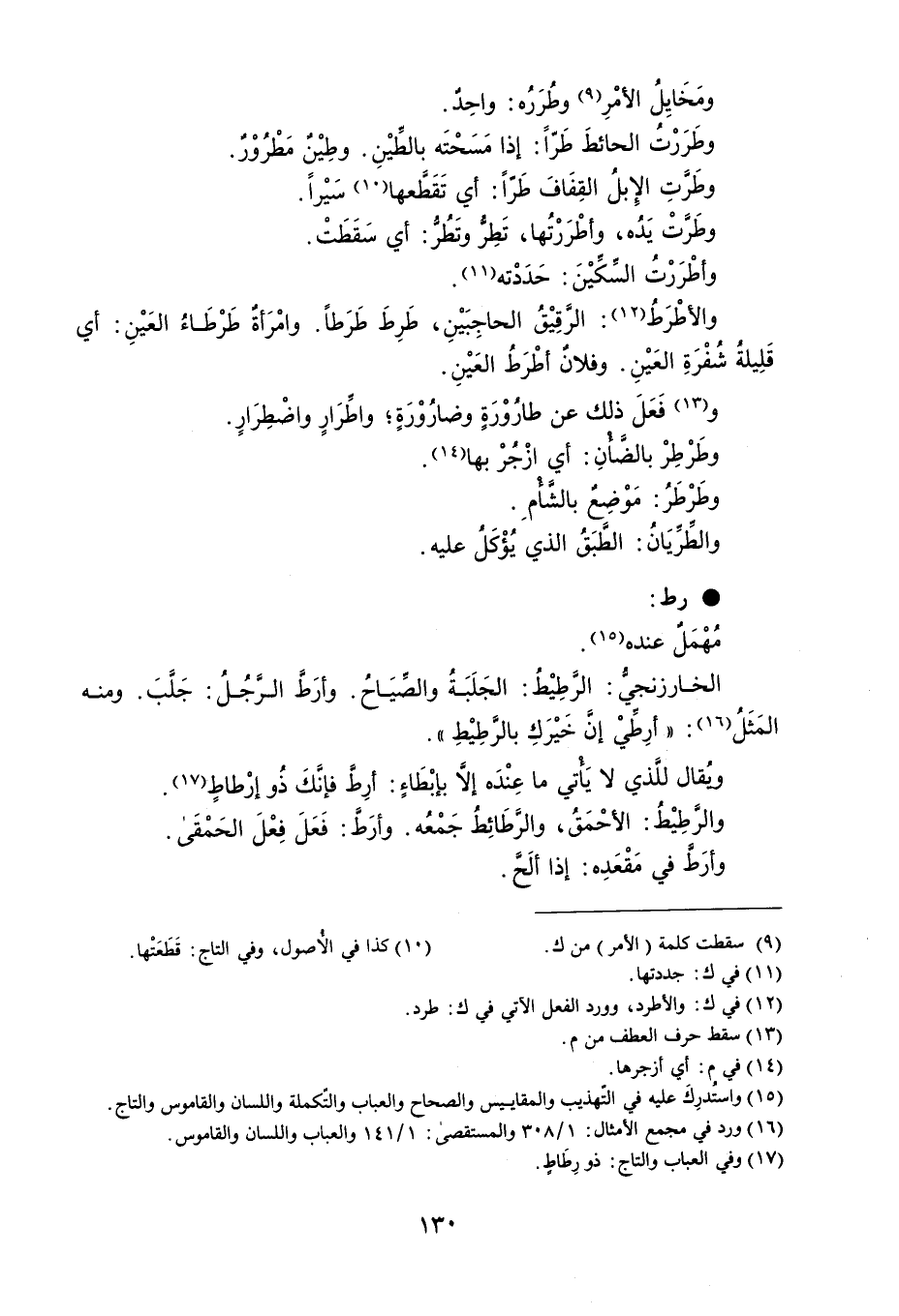 ومَخَايِلُ الأمر وطُرَرُه : واحِد . وطَرَرْتُ الحائطَ طَرّاً : إذا مَسَحْتَه بالطِّيْنِ . وطِيْنٌ مَطْرُوْرٌ . وطَرَّتِ الإبلِ القِفَافَ طَرّاً : أي تَقَطَّعها سَيْراً . وطَرتْ يَدُه ، وأطْرَرْتُها ، تَطِرُّ وتَطُرُّ : أي سَقَطَتْ . وأطْرَرْتُ السكَيْنَ : حَدَدْته . والأطْرَطُ : الرَّقِيْقُ الحاجِبَيْنِ ، طَرِطَ طَرَطاً . وامْرَأةٌ طَرْطَاءُ العَيْنِ : قَلِيلةُ شُفْرَةِ الجَيْنِ . وفلانٌ أطْرَطُ العَيْنِ . وفَعَلَ ذلك عن طارُوْرَةٍ وضارُوْرَةٍ ؛ واطِّرَارٍ واضْطِرَارٍ . وطَرْطِرْ بالضَّأنِ : أي ازْجُرْ بها . وطَرْطَرُ : مَوْضِعٌ بالشَّامِ . والطِّريَانُ : الطَّبَقُ الذي يُؤْكَلُ عليه . رط مُهْمَلٌ عنده . الخارزنجيُّ : الرَّطِيْطُ : الجَلَبَةُ والصِّيَاحُ . وأرَطَّ الرجُلُ : جَلَّبَ . ومنه المَثَلُ : ' أرِطِّيْ إنَ خَيْرَكِ بالرَّطِيْطِ ' . ويُقال للذي لا يَأتي ما عِنْدَه إلأَ بإبْطَاءٍ : أرِطَّ فإنَكَ ذُو إرْطاطٍ . والرطِيْطُ : الأحْمَقُ ، والرَّطَائِطُ جَمْعُه . وأرَطَّ : فَعَلَ فِعْلَ الحَمْقَى . وأرَطَّ في مَقْعَدِه : إذا ألَحَّ .