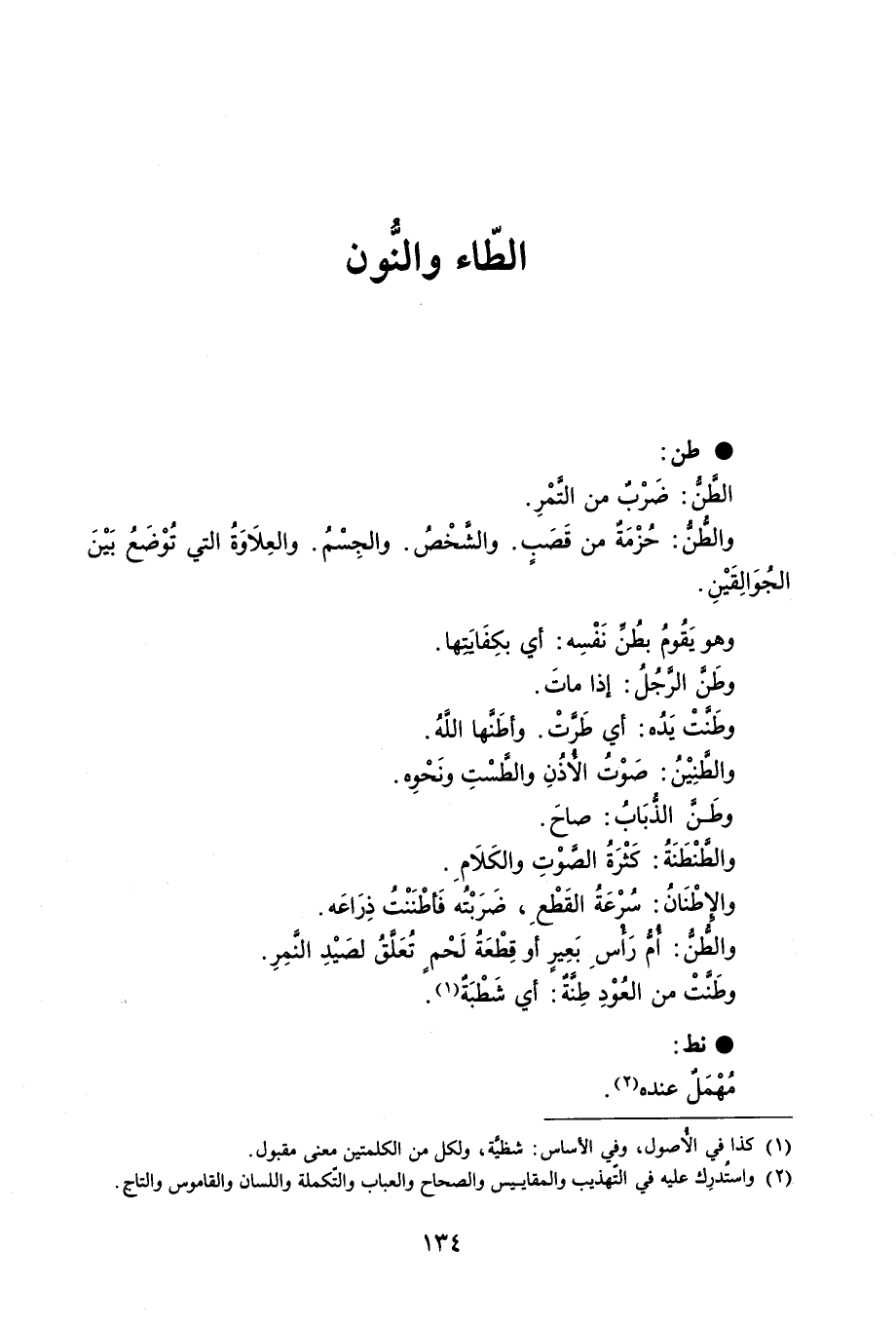 طن الطَنُ : ضَرْب من التمْرِ . والطنُ : حُزْمَة من قَصَبٍ . والشَّخْصُ . والجِسْمُ . والعِلاوَةُ التي تُوْضَعُ بَيْنَ الجُوَالِقَيْنِ . وهويَقُومُ بطُن نَفْسِه : أي بكِفَايَتِها . وطَن الرجُلُ : إذا ماتَ . وطَنَتْ يَدُه : أي طَرتْ . وأطَنها اللهُ . والطَّنِيْنُ : صَوْتُ الأذُنِ والطسْتِ ونَحْوِه . وطَن الذُّبَابُ : صاح . والطنْطَنَةُ : كَثْرَةُ الصَّوْتِ والكَلامِ . والإطْنَانُ : سُرْعَةُ القَطْعِ ، ضَرَبْتُه فَاطْنَنْتُ ذِرَاعَه . والوطن : أمُّ رَأسِ بَعِيرٍ أو قِطْعَةُ لَحْمٍ تُعَلقُ لصَيْدِ النمِرِ . وطَنتْ من العُوْدِ طِنة : أي شَطْبَةٌ .