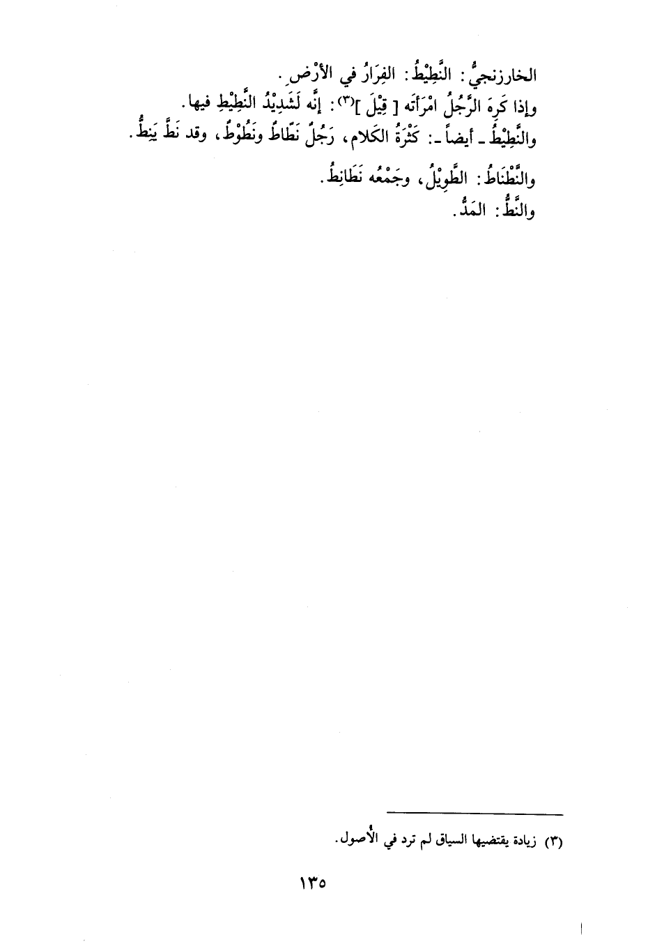 الخارزنجي : النَطِيْطُ : الفِرَارُ في الأرْضِ . وإذا كَرِهَ الرجُلُ امْرَأتَه قِيْلَ : إنَّه لَشَدِيْدُ النَّطِيْطِ فيها . والنَطِيْطُ - أيضاً - : كَثْرَةُ الكَلام ، رَجُلٌ نَطّاطٌ ونَطُوْطٌ ، وقد نَط يَنطُ . والنَطْنَاطُ : الطويلُ ، وجَمْعُه نَطَانِطُ . والنَطُّ : المَدُ .