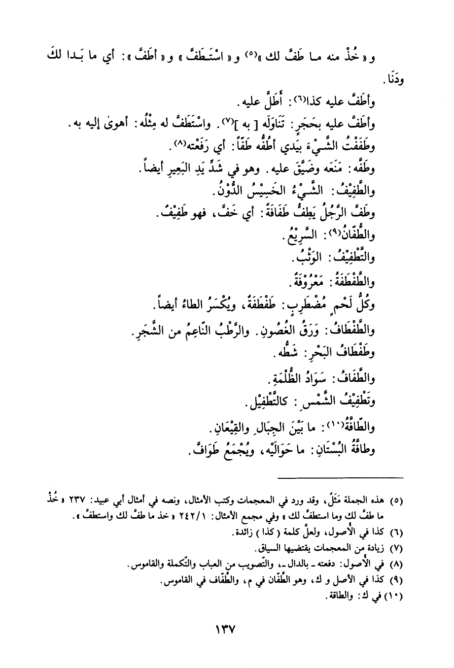 و ' خُذْ منه ما طَفَ لك ' و ' اسْتَطَف ' و ' أطَفَّ ' : أي ما بَدا لك ودَنَا . وأطَف عليه كذا : أطَلَّ عليه . وأطَف عليه بحَجَرٍ : تَنَاوَلَه به . واسْتَطَفَّ له مِثْلُه : أهوى إليه به . وطَفَفْتُ الشيْءَ بيَدي أطُفُّه طَفّاً : أي رَفَعْته . وطَفَه : مَنَعَه وضَيق عليه . وهوفي شَد يَدِ البَعِيرِأيضاً . والطَفِيْفُ : الشَّيْءُ الخَسِيْسُ الدُّوْنُ . وطَفً الرجُلُ يَطِفُّ طَفَافَة : أي خَفَّ ، فهو طَفِيْفٌ . والطُفانُ : السَّرِيْعُ . والتَطْفِيْفُ : الوَثْبُ . والطَّفْطَفَةُ : مَعْرُوْفَة . وكُل لَحْمٍ مُضْطَرِب : طَفْطَفَةٌ ، وُيكْسَرُالطاءُ أيضاً . والطَّفْطَافُ : وَرَقُ الغُصُونِ . والرطْبُ الناعِمُ من الشَّجَرِ . وطَفْطَافُ البَحْرِ : شَطُّه . والظفَافُ : سَوَادُ الظلْمَةِ . وتَطْفِيْفُ الشَّمْسِ : كالتطْفِيْل . والطافةُ : ما بَيْنَ الجِبَالِ والقِيْعَانِ . وطافةُ البُسْتَانِ : ما حَوَالَيْه ، وُيجْمَعُ طَوَاف .
